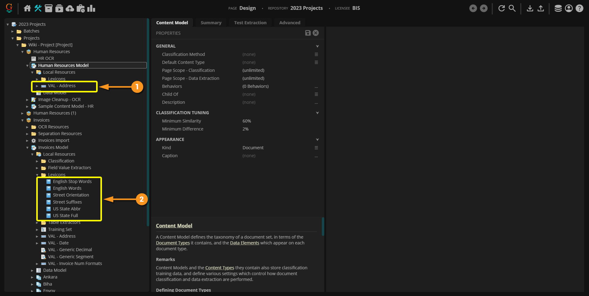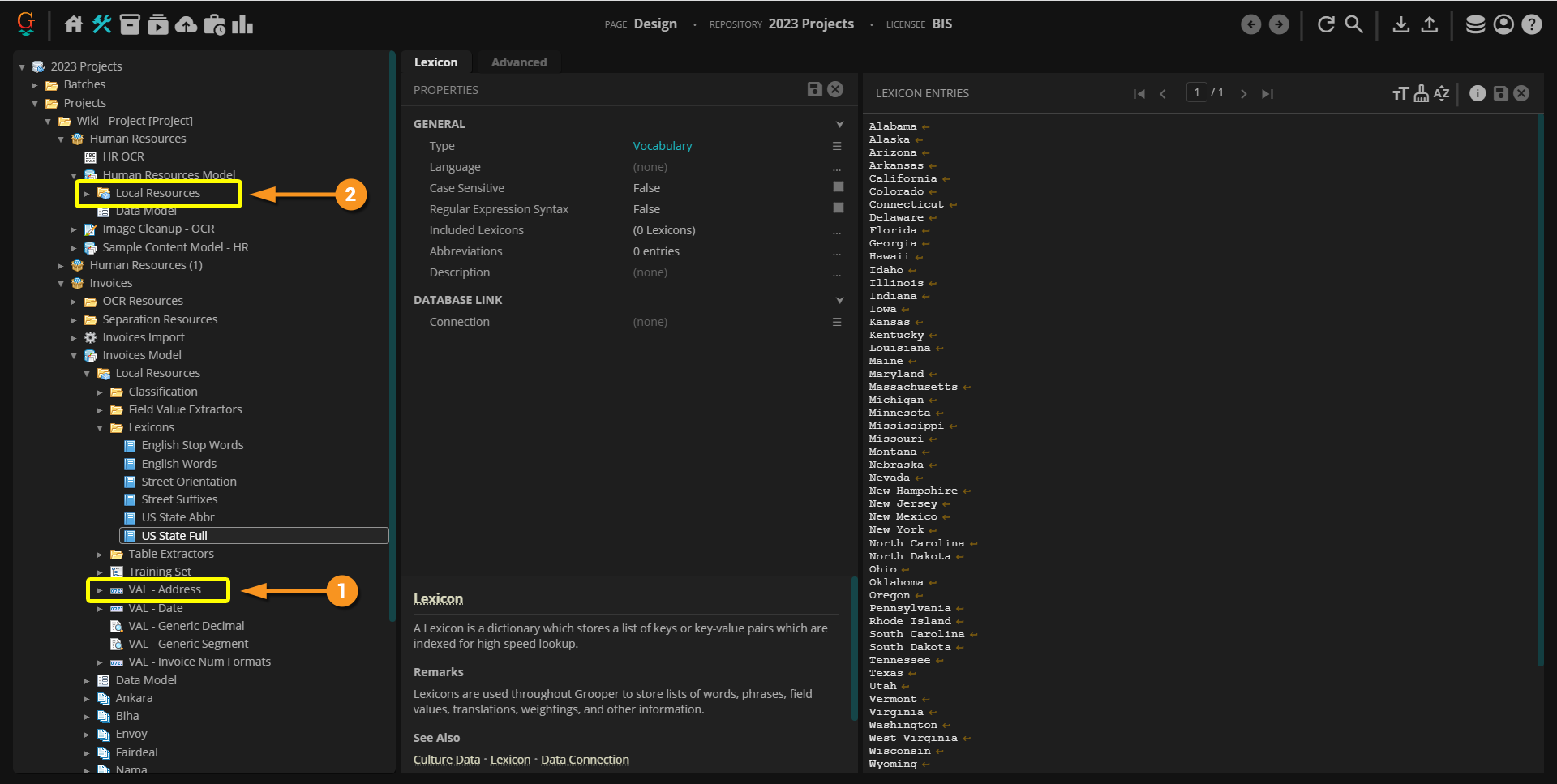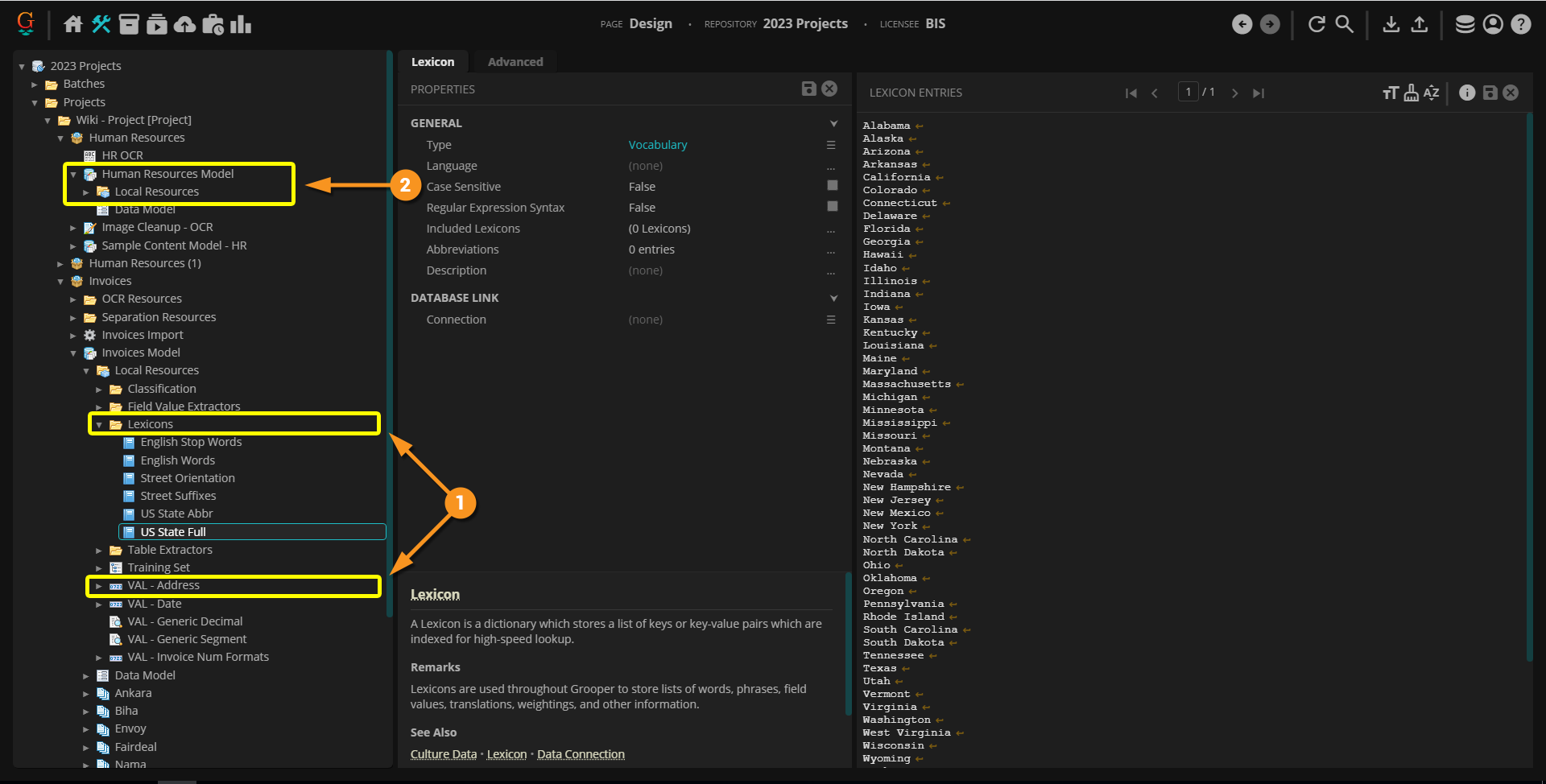 A Project is the primary container in which document processing components are created, configured, and organized. It is a library of resources, such as Content Models, Batch Processes, OCR Profiles, Lexicons, and more, needed to process documents through Grooper.