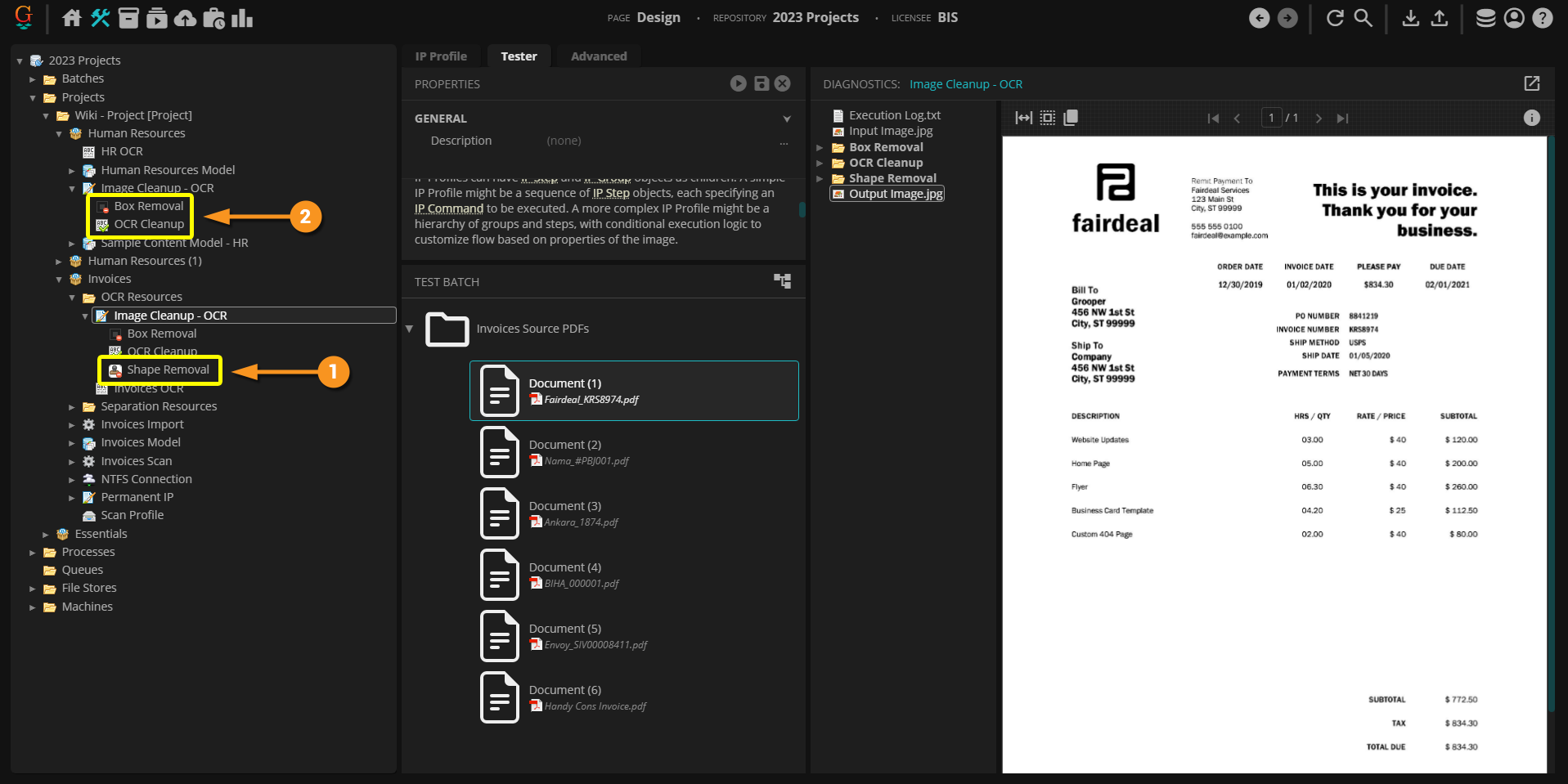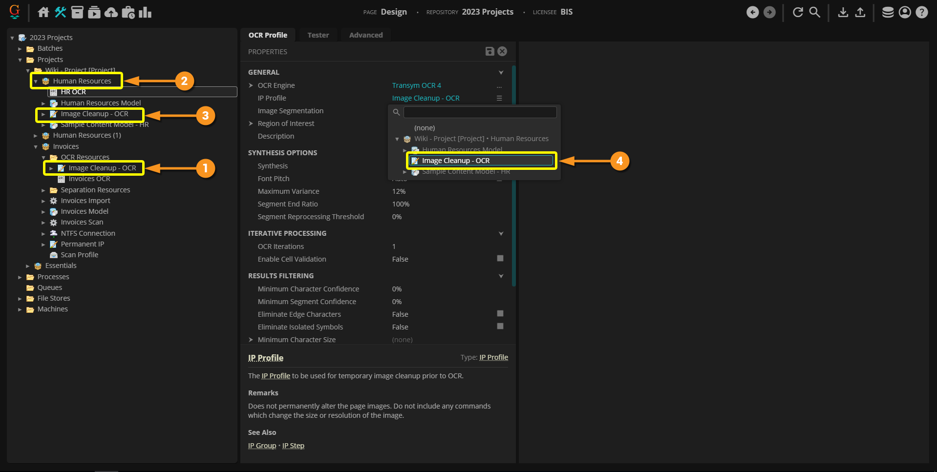 For example, in our "Invoices" Project, the "Invoices OCR" OCR Profile references the "Image Cleanup - OCR" IP Profile to perform temporary image processing prior to running OCR.