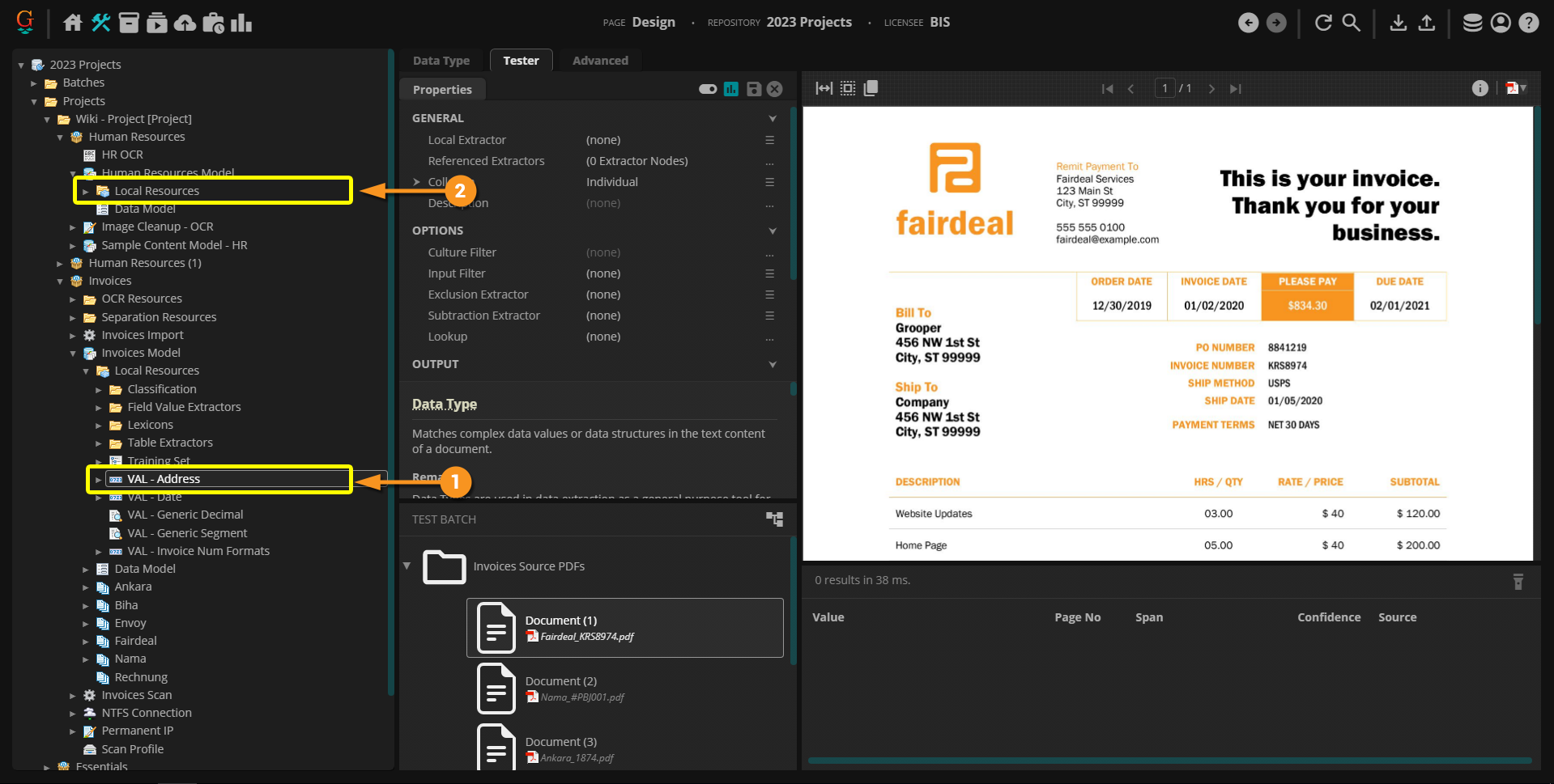 Furthermore, there are situations where Grooper will not let you copy objects from one Project and paste them into another. This is a very intentional part of the Project object's design, done to preserve reference integrity. Grooper allowed us to copy and paste the IP Profile because it did not reference any other object in its original Project. If it did, its functionality would be dependent on that referenced object in the first Project being present in the second Project. Let's look at another example. In our "Invoice" Project's Content Model, we've built some extractor assets, including an address extractor. Let's say we want to bring that extractor into our "Human Resources" Project's Content Model.