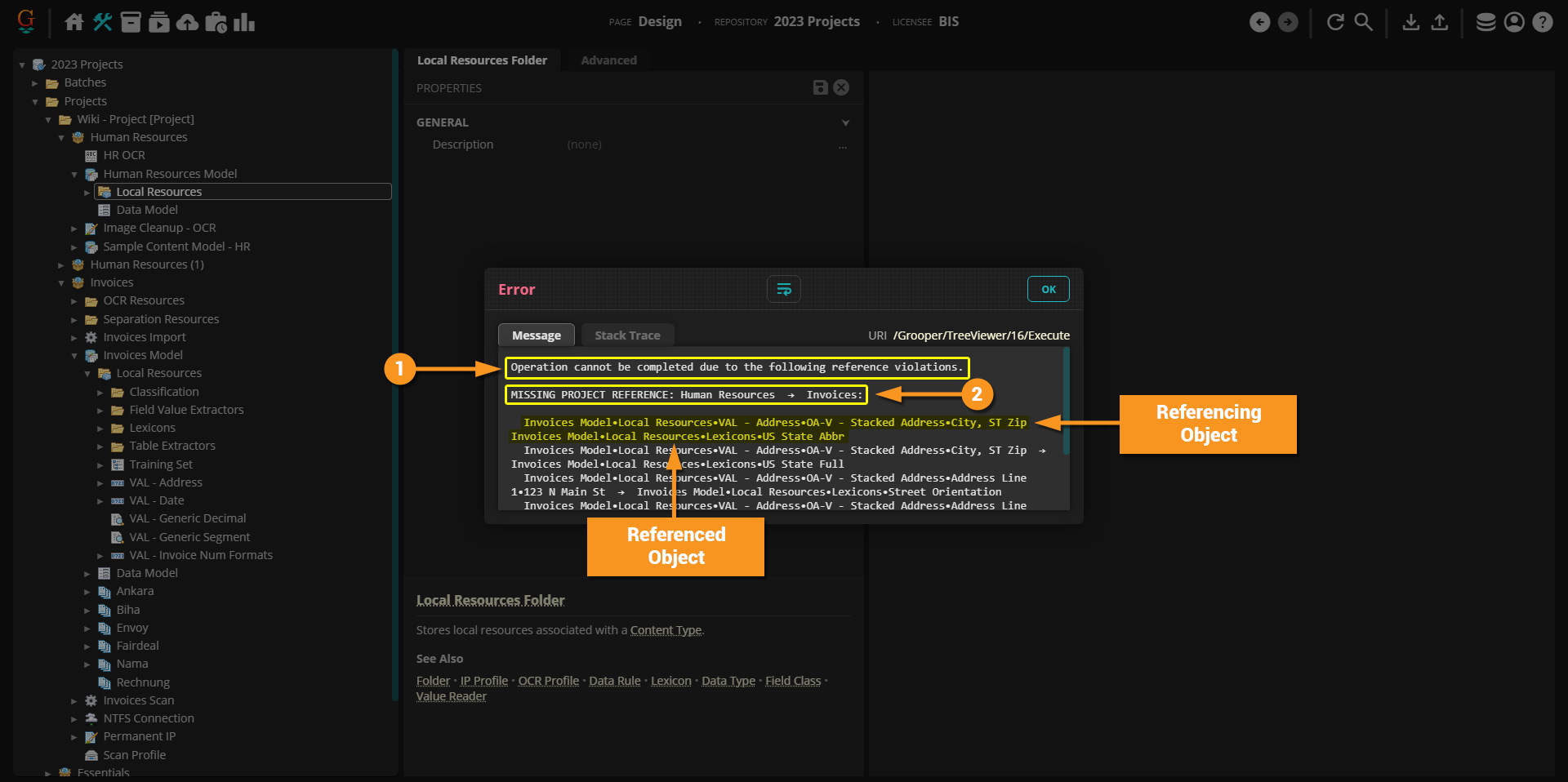 This is a big "no-no" that was technically possible in Grooper, but never considered best practice. This may have happened by accident when copying a Content Model. This may have been a "quick fix" that some Grooper designer did, intending to go back and resolve but never got around to it. Who knows. The main issue is these types of reference violations can cause problems down the road, potentially causing corruption in your Grooper environment. Part of the reason Projects were created was to avoid this type of corruption due to improperly referenced objects. Referencing Projects via the Referenced Projects property makes external resource references much more intentional, avoiding accidental reference violations (as much as possible). |