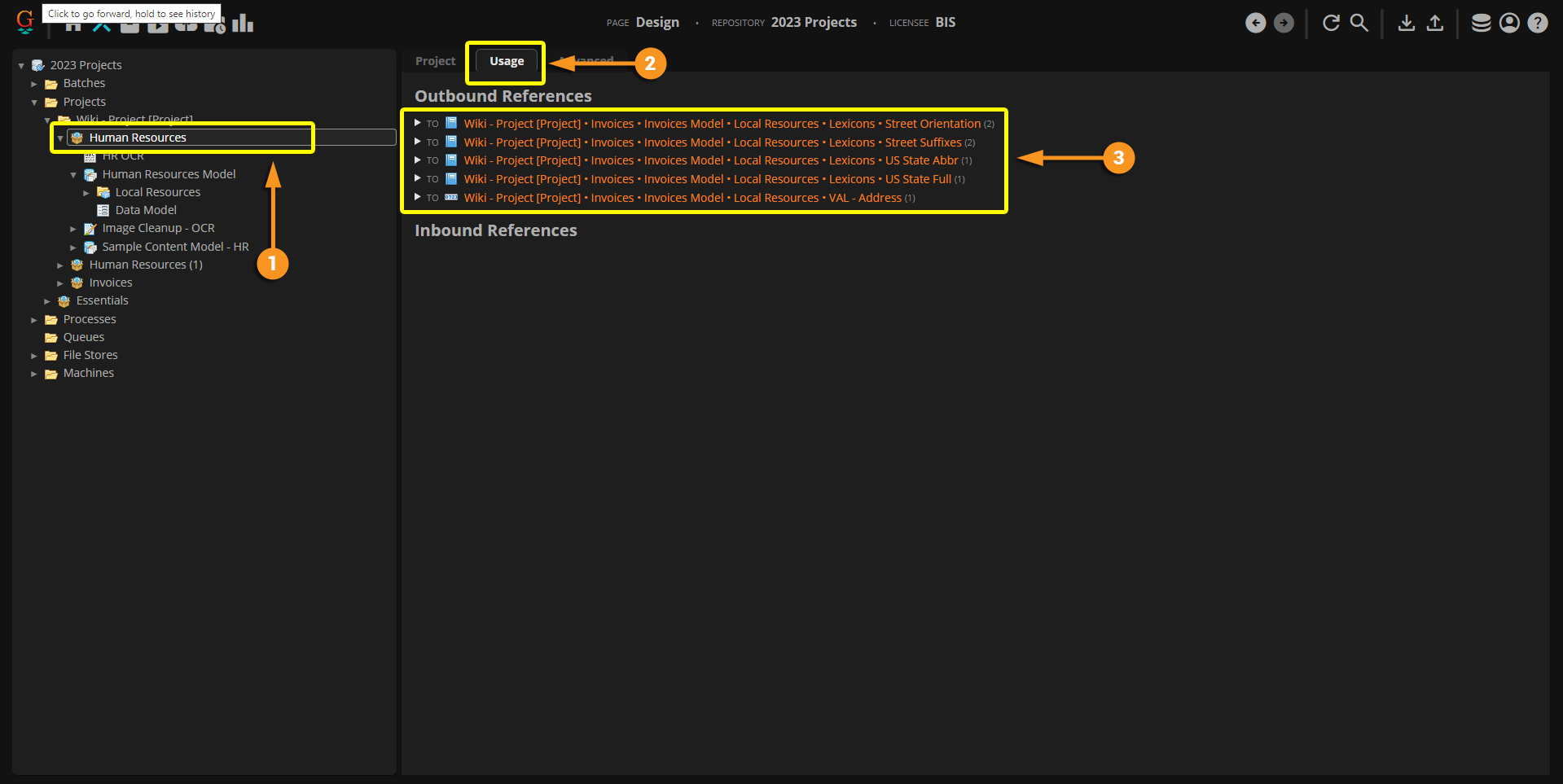 We've decided the "Human Resources" Project will retain its reference to "Project 1." If you want, you can verify the references with the "Usage" tab.