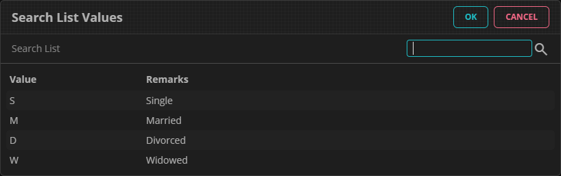 • The "Search List Value" button will open a window to search for items in the selection list.
