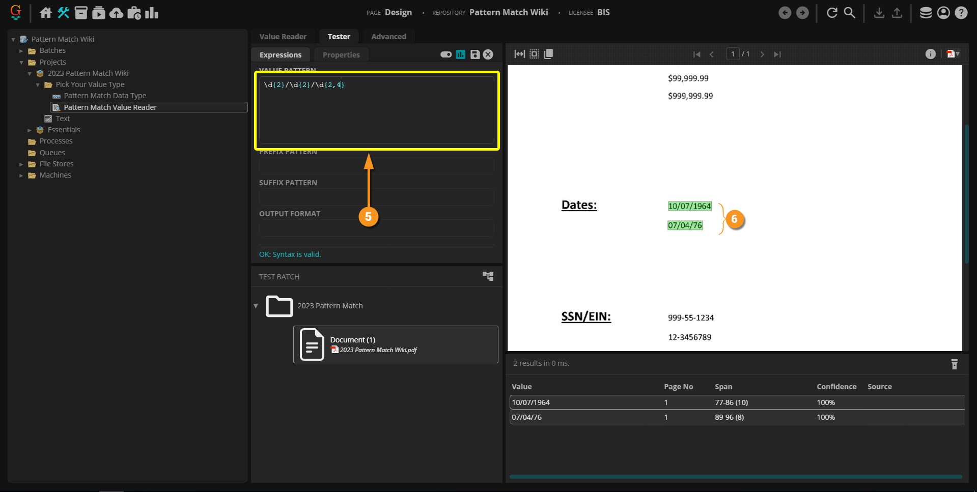 • \d{2,4} tells Grooper to look for anywhere from two to four digits for the year. Since YY and YYYY fall within the range set, the regex pattern will extract them.