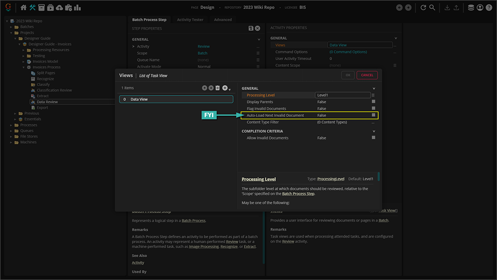 The Allow Invalid Documents property determines if the Review task can be completed when invalid documents with data validation errors still present in the Batch.
