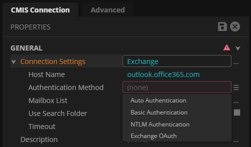 - OAuth Authentication - Implements OAuth 2.0 for connections to Exchange. If you choose this method, you will click a nested button to log in using a Microsoft account.