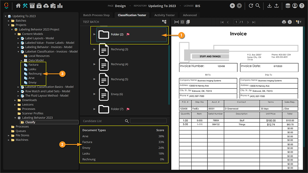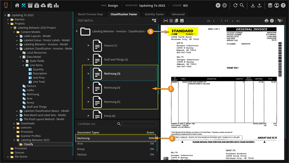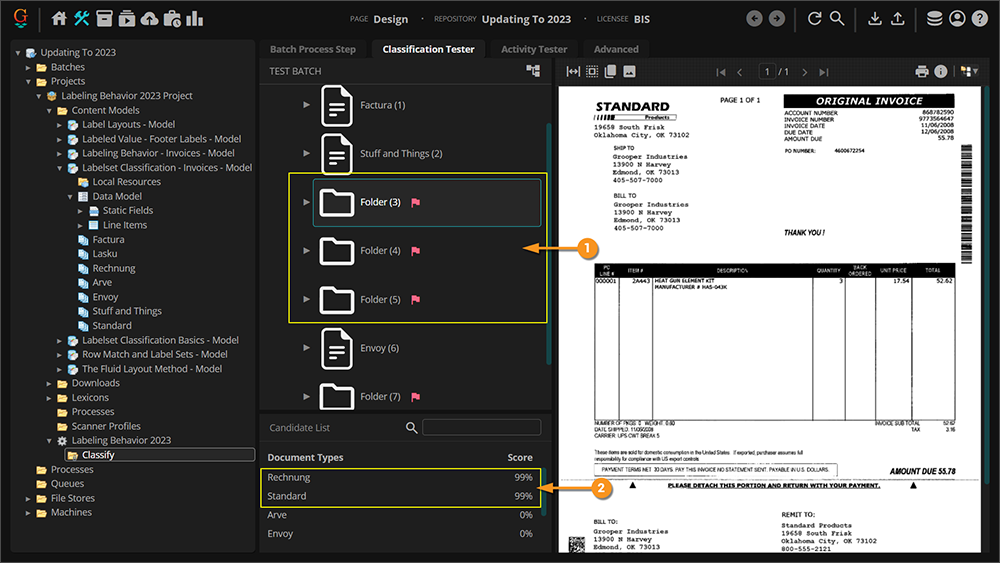 1. Here, we have selected a "Rechnung" Document Type folder in the "Labeling Behavior - Invoices - Test Batch" Batch.