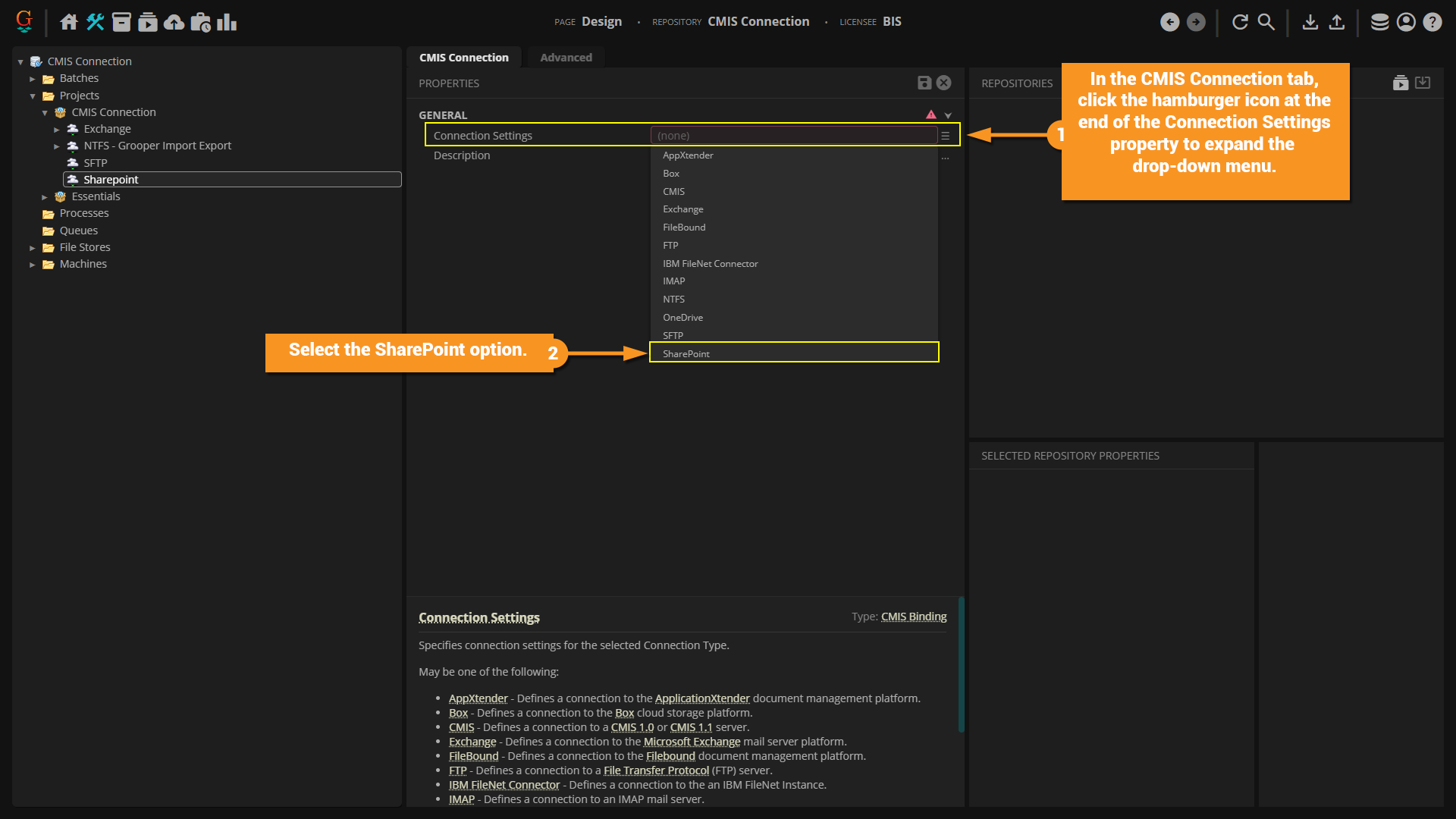 The SharePoint Connection Type is a CMIS binding that connects to Microsoft SharePoint, providing access to content stored in Document Libraries and Picture Libraries.