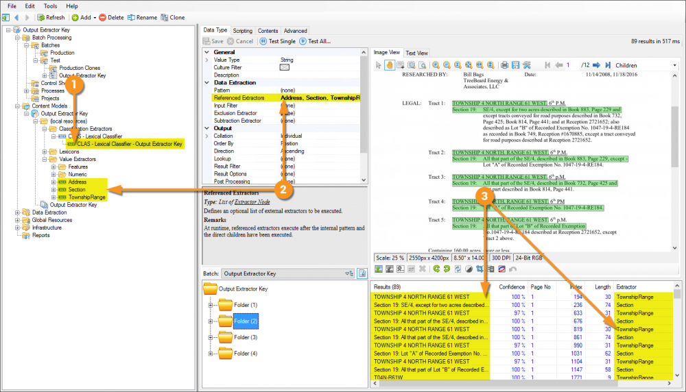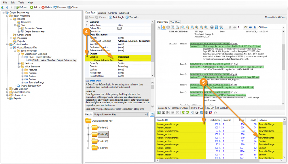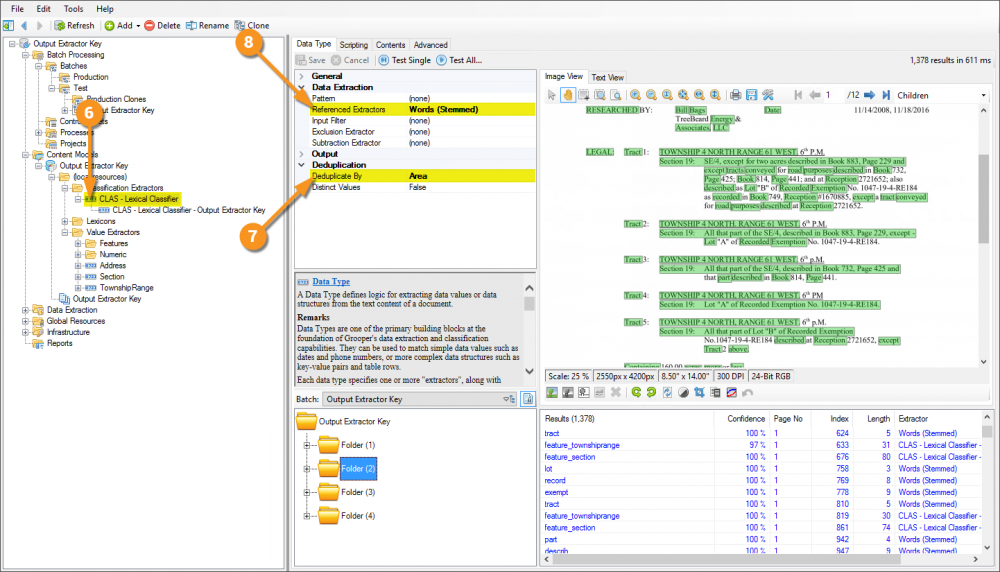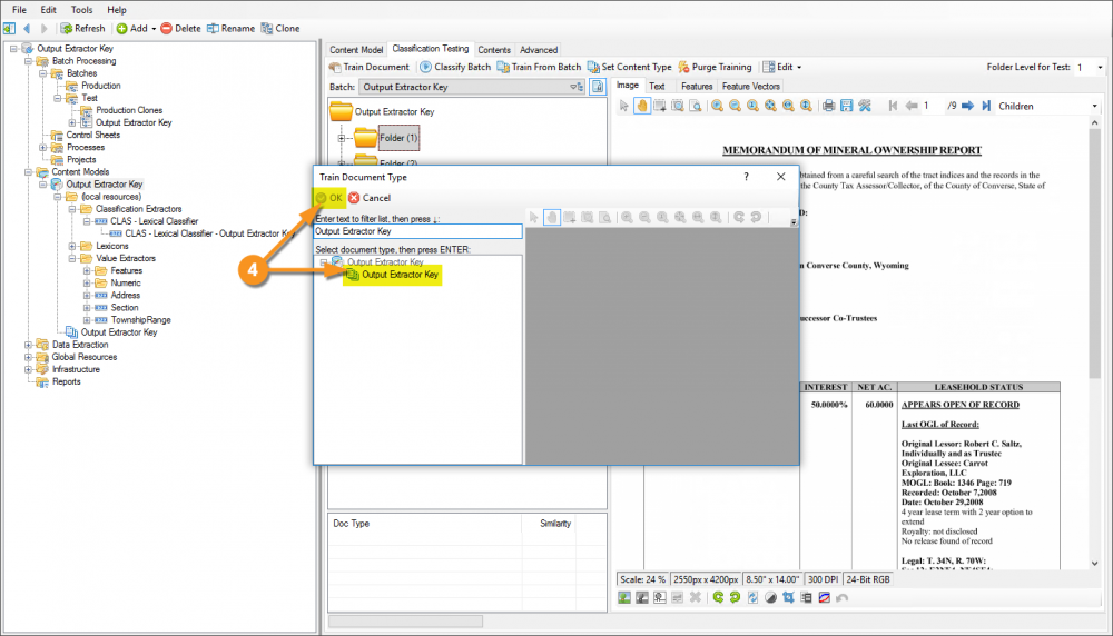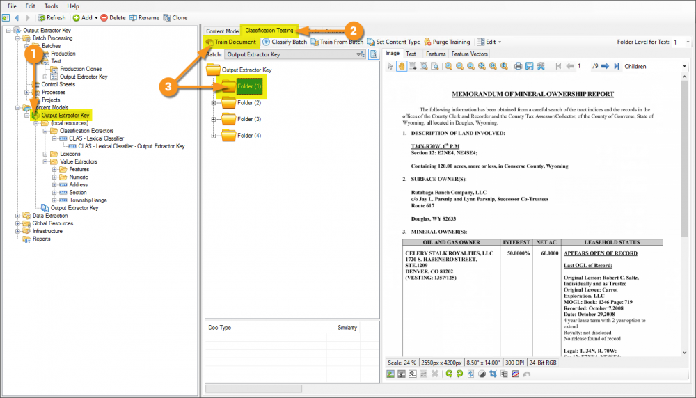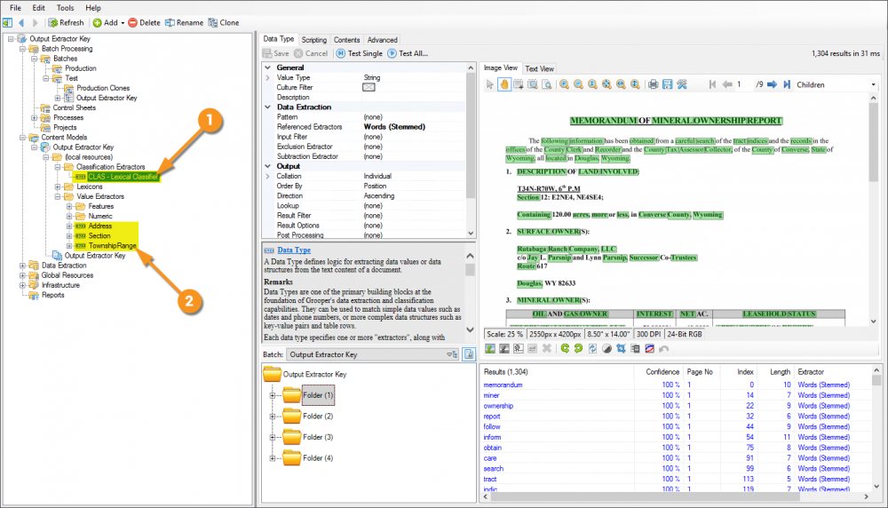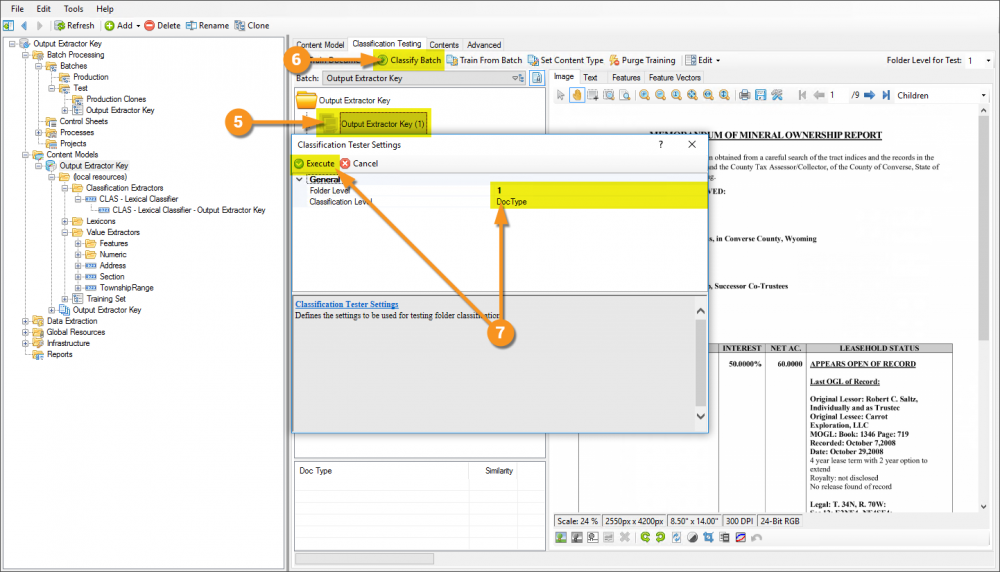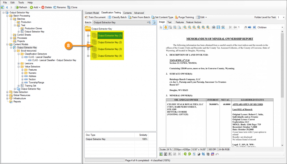 Following is an example of how to configure a Data Type to use the Output Extractor Key property, then configure the Content Model to leverage it for the purposes of classification. In this example are a few different document formats, but all are Mineral Ownership Reports. In spite of their different formats, because they have similar content, the use of the aforementioned extractor will make their classification quite simple.