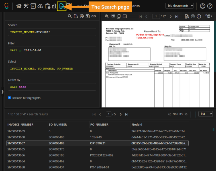 * The Search page uses a powerful set of query and filtering capabilities to retrieve documents, using full text and metadata searching techniques.