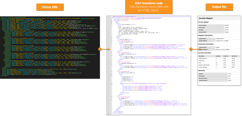 • Example: Transform this XML into an HTML report. (This would transform source data into a more human-readable document by transforming the XML data to HTML tags)