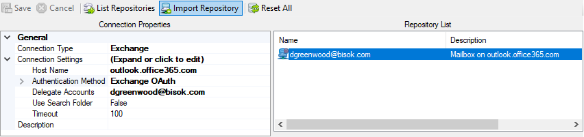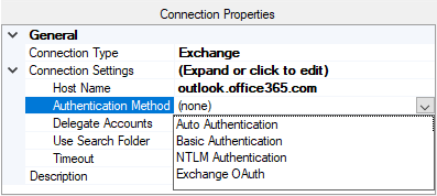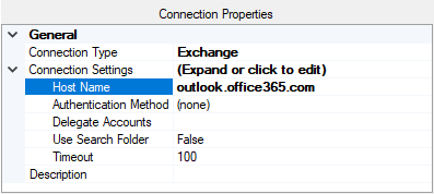 In the "Connection Properties" panel, select "Exchange" from the "Connection Type" drop down list. Expand the "Connection Settings" heading. Enter the host name or IP address of the Microsoft exchange server. For example, "outlook.office365.com" is the hostname for exchange online.