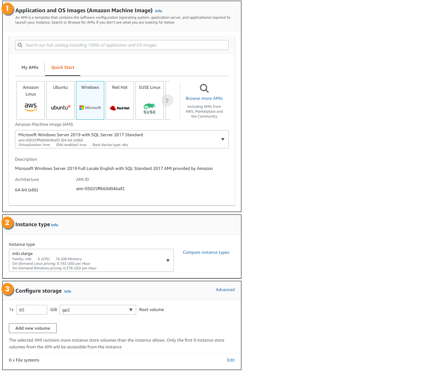 • We selected the "m6i.xlarge" instance type, which meets these requirements. There are, however, other instance types that also meet these requirements. For example, the "t3.xlarge" has the same number of cores and RAM, but is cheaper and performs slower.