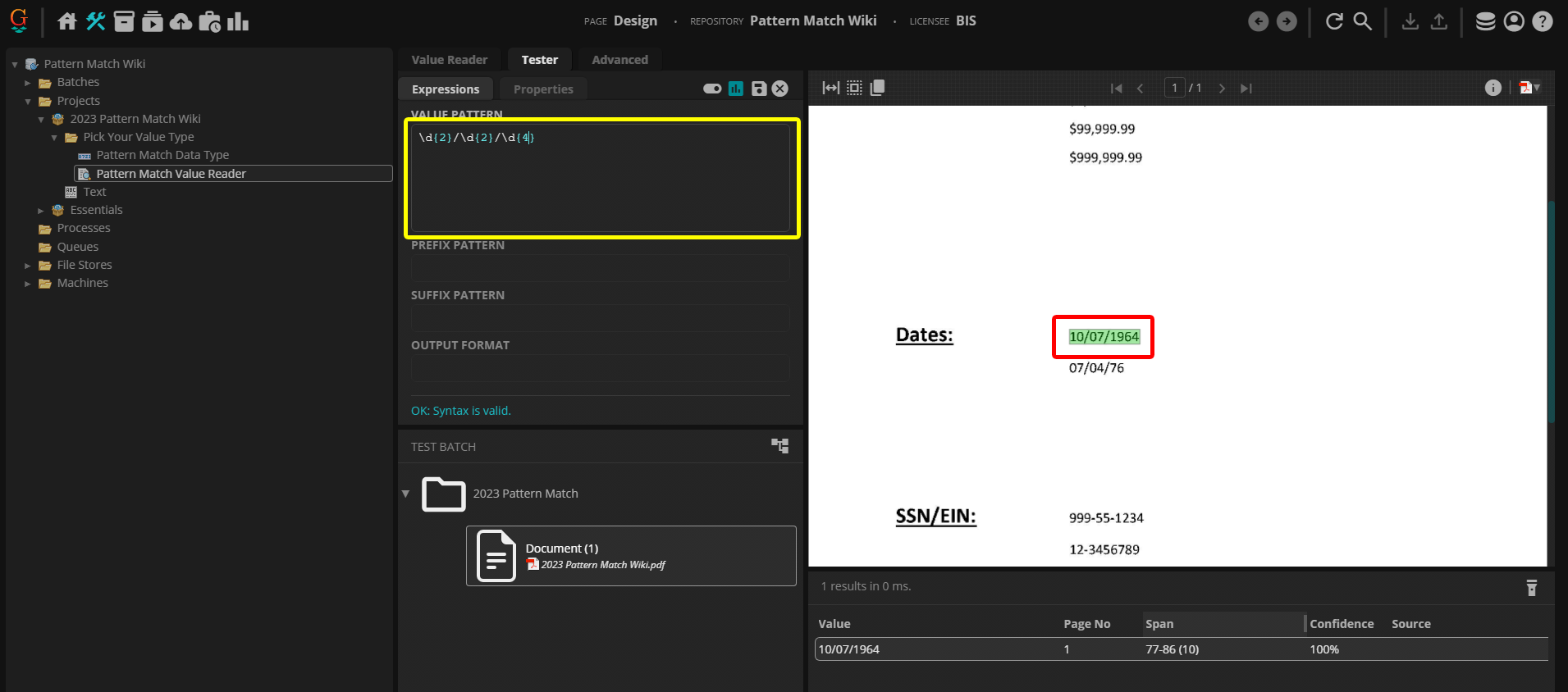 3. For this document, the regex pattern will be \d{2}/\d{2}/\d{4}