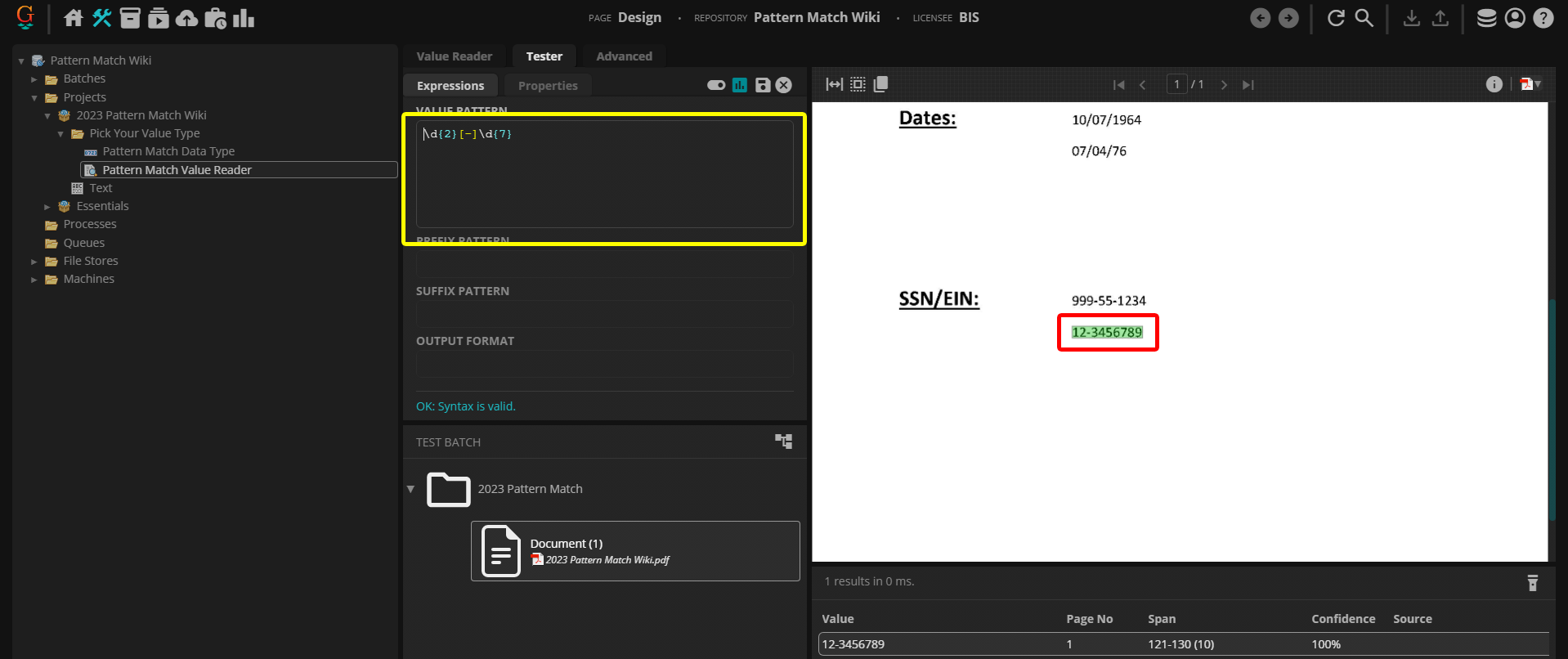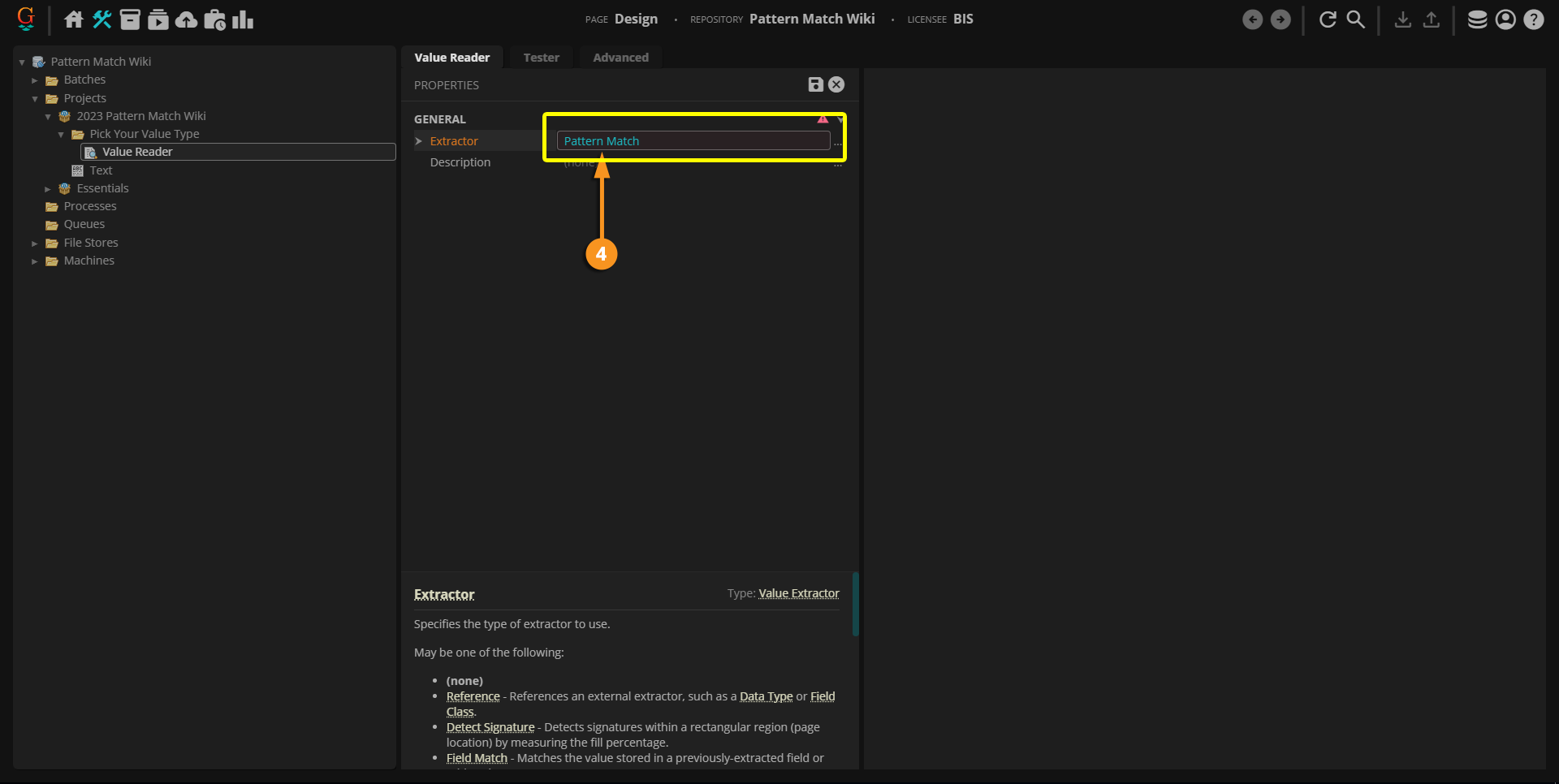 Pattern Match is one of the most commonly used extractors for general data. As per its name, it extracts data from a document matching a regex pattern entered into the Value Pattern.