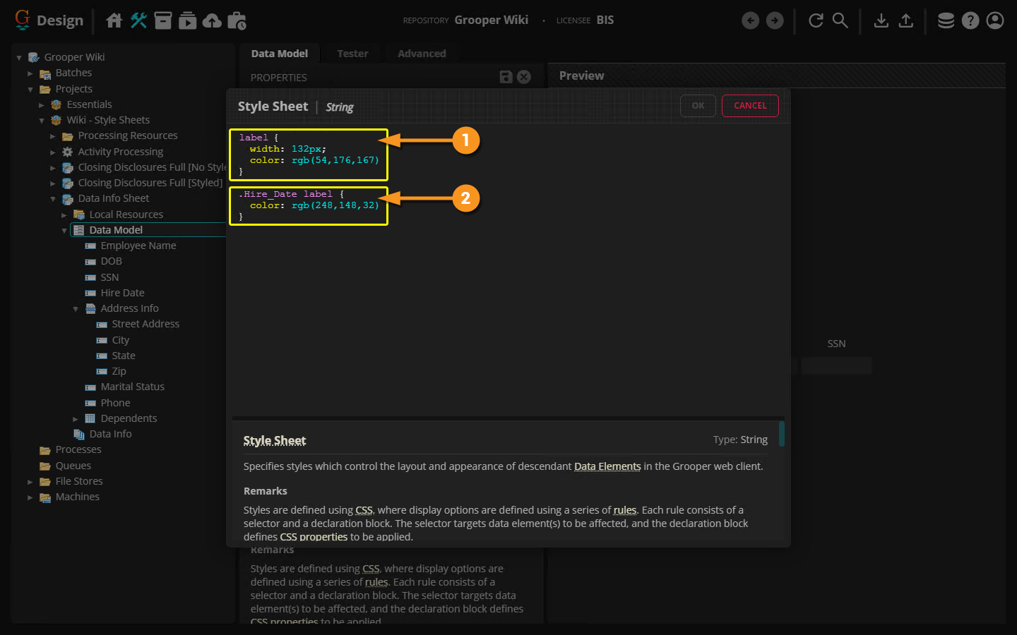 In Grooper, you can style your Data Model with custom CSS, changing how it appears during the Review activity (and previewed in the Design page). If you are using the Web Client, elements in your Data Model (Data Fields, Data Sections, etc.) are all rendered as some combination of HTML elements themselves when viewed over a browser. You can style how these elements are presented using CSS style sheets. This gives you a great deal of control over what you and your reviewers see in the Data Viewer during the Review activity.