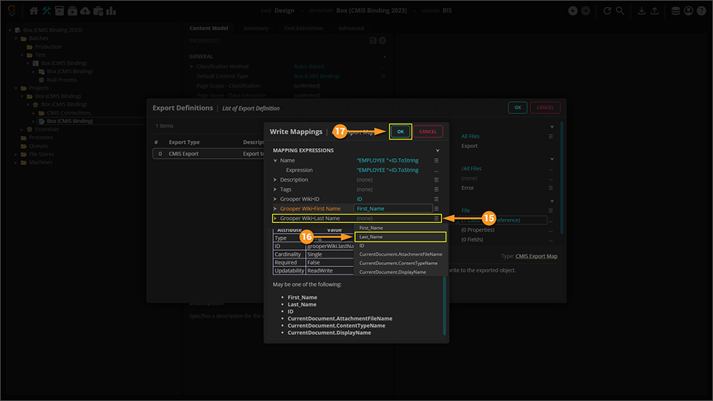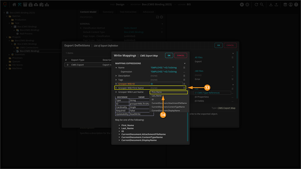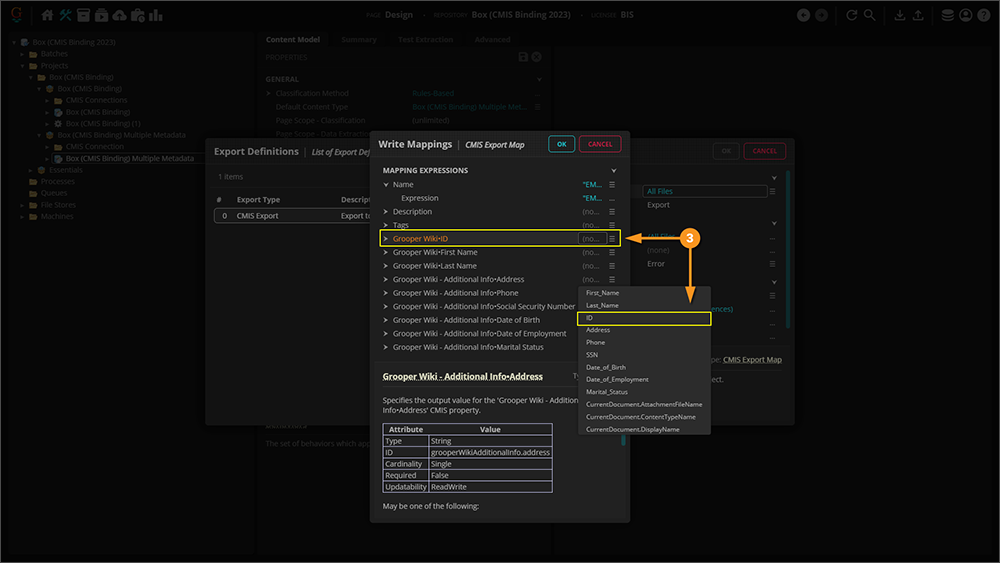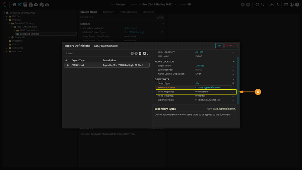 • The obvious difference is in the Secondary Types and Write Mappings sections. Since we mapping to multiple Metadata types, we have two CMIS Type References and seven additional properties that are associated with the Grooper Wiki - Additional Info Secondary type.