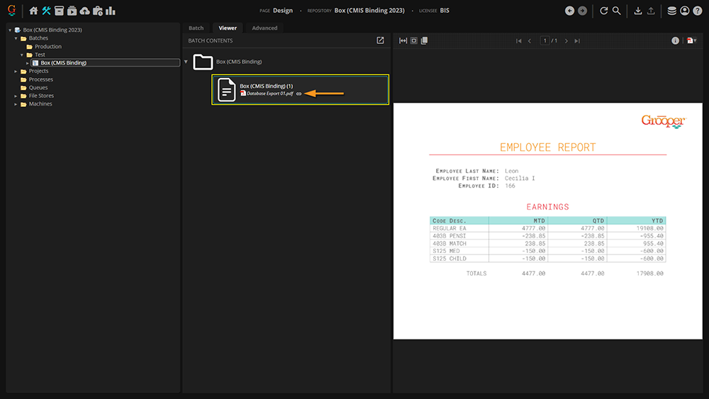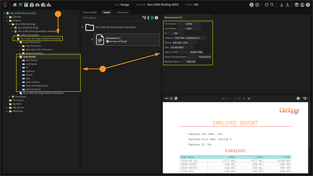 Selecting the newly imported document, you will be able to view the Metadata mapped to the document from Grooper.