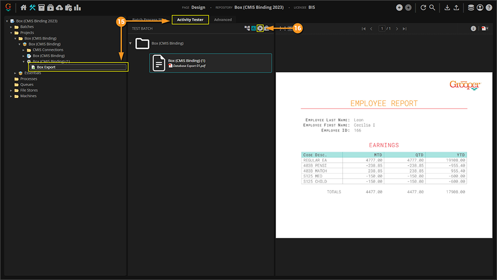 1. With everything set up in the Batch Process Step, navigate to the Activity Tester tab.