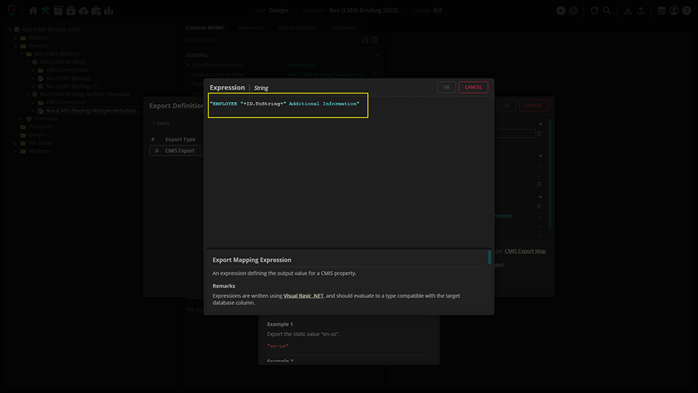 • Note that while our Repository and Target Folder appear the same as those of the earlier section, a different CMIS Repository was created. The document will still be exported to the same place in Box, however.