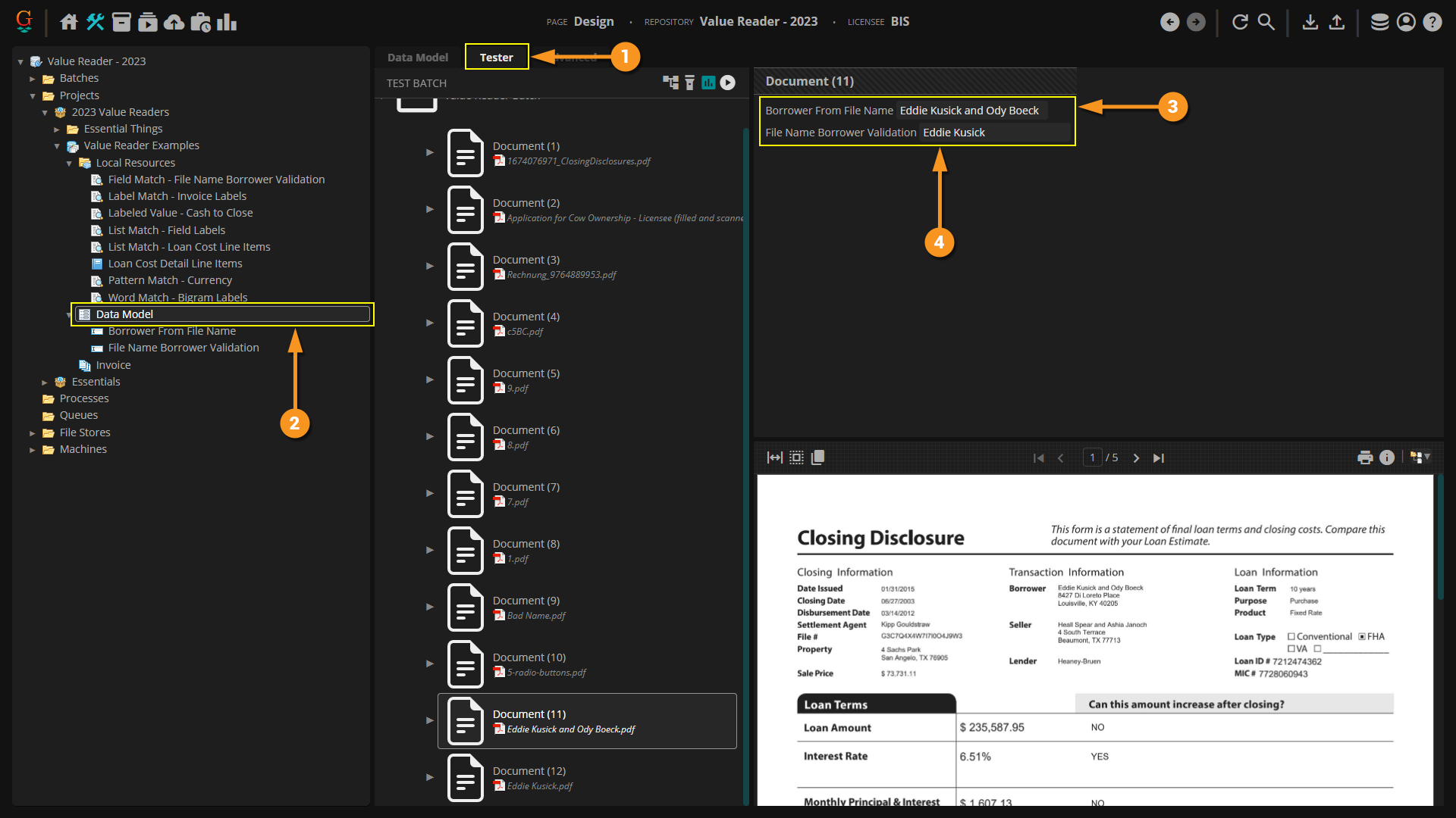 This could be used for data validation purposes. We've been using Closing Disclosure forms for most of these examples. Let's say the original imported file we imported for processing was named after the loan's borrower. So if John Doe was applying for the loan, the Closing Disclosure would be named "John Doe.pdf". You might want to know if the borrower's name according to the filename actually lines up with the borrower listed on the document. You could do just that with a Field Match extractor.