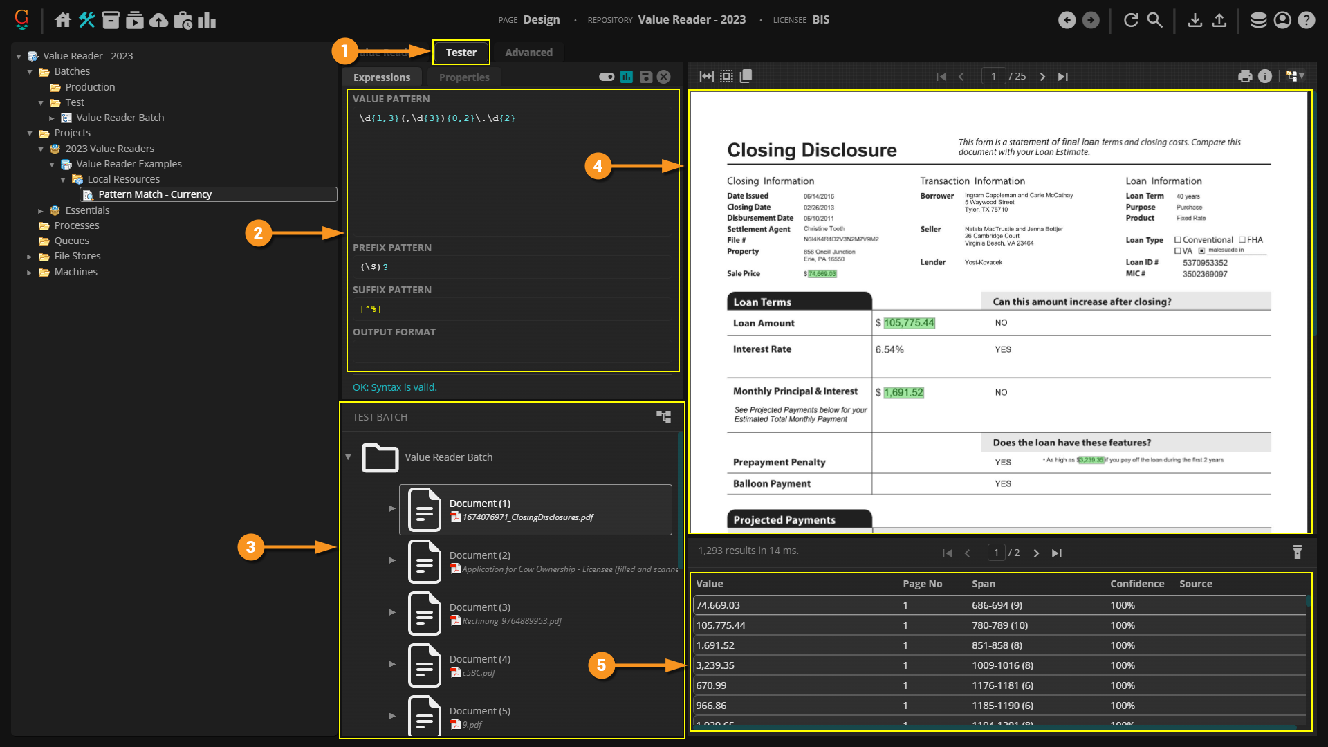 In this example, a Value Reader is configured to return the "Loan Amount" value as described on the first page of a Closing Disclosure form, using the Read Zone Extractor Type.
