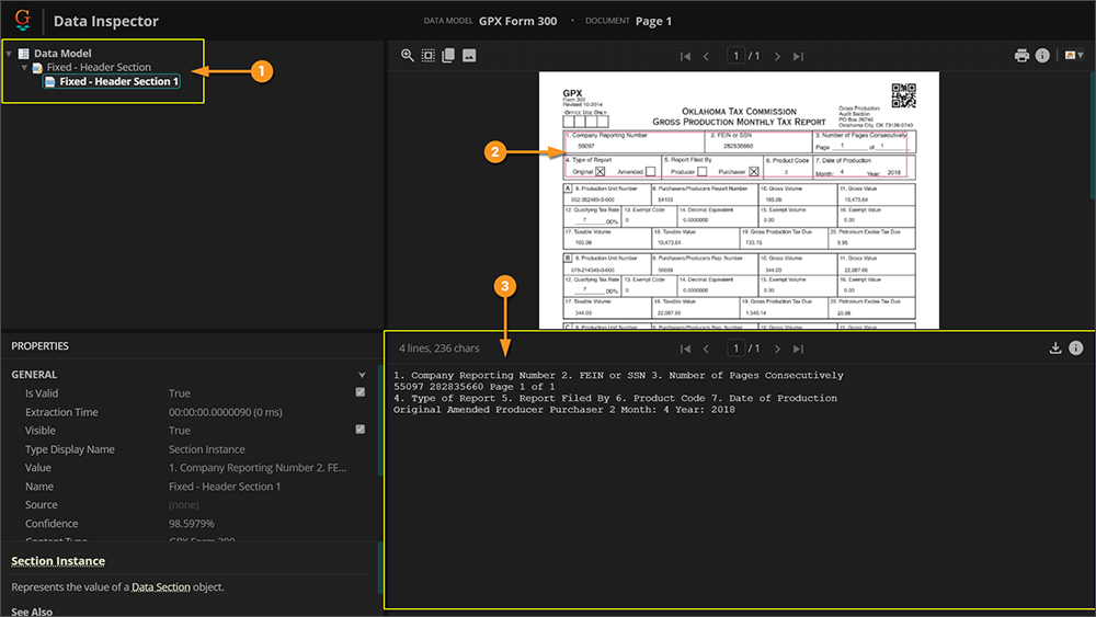 In this example, we will demonstrate how to create a Data Section returning the first page of this "Gross Production Monthly Tax Report" as the section instance.