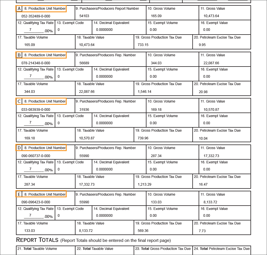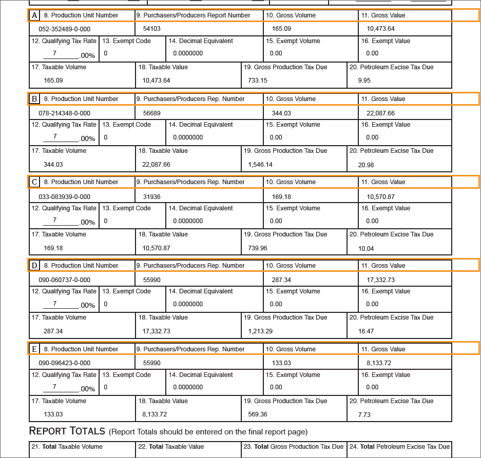 The Divider, Geometric, and Simple section extraction methods get into the "meat and potatoes" functionality of Data Sections. As well as being able to target single-instance sections, they have increased functionality to target multiple repeating sections containing the same data. We will target the repeating sections on this "Gross Production Monthly Tax Report" (henceforth called "Reporting Sections"). These sections can be targeted in different ways using any of these three section extraction methods. Their configurations are a little different, but at the end of the day, each of them can easily intuit the five reporting sections and their general boundaries. GeometricThe Geometric method uses a variety of tools in Grooper's toolbox to create a logical rectangular region around the sections you wish to extract. Any and all text falling within these rectangular zones form the section instances. The basic process to draw these zones is two-fold.
