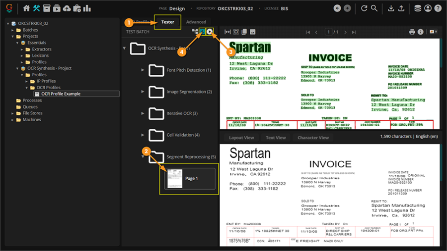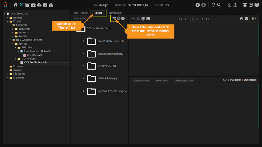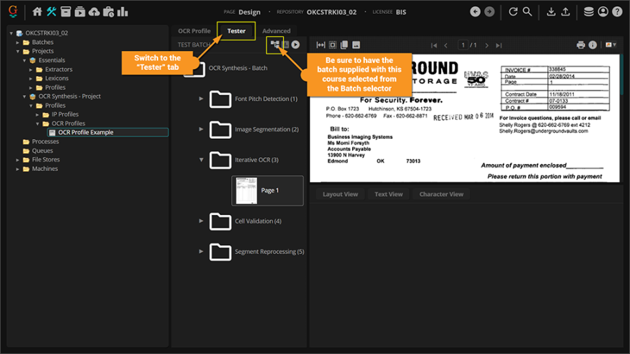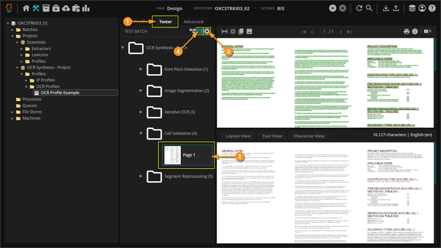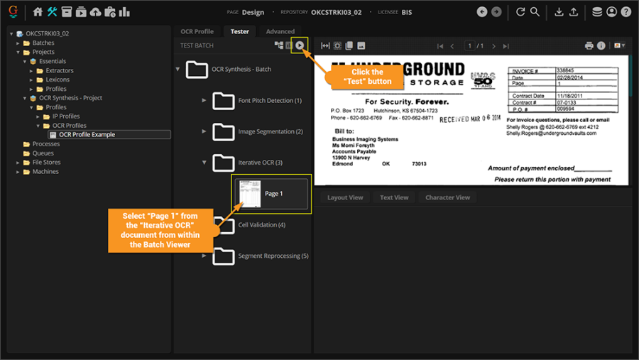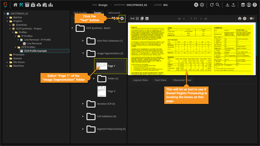 Select a page from the Test Batch and press the "OCR Page" button. This will perform OCR on only the selected page to test out the OCR profile.