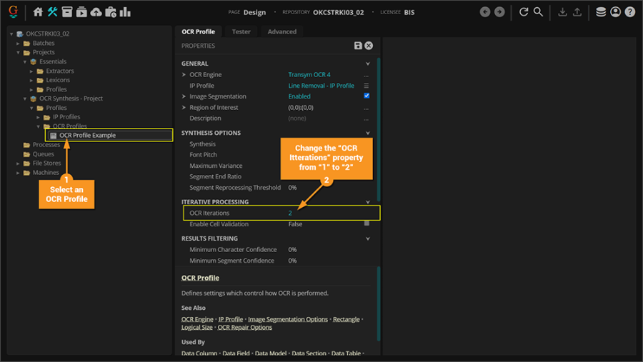With Synthesis enabled, "OCR Iterations" is a configurable property on OCR Profiles.