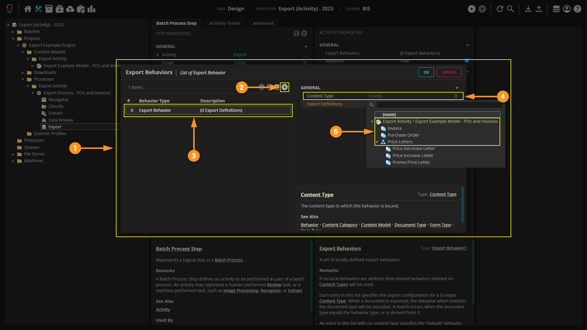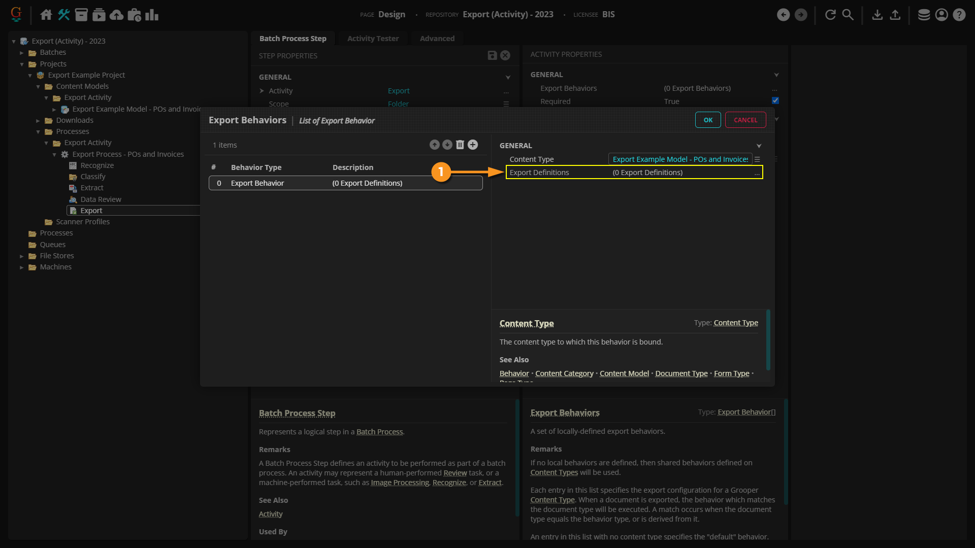 The Export activity exports documents according to an Export Behavior. This is a set of export property configurations based on the Content Type (i.e. Document Type of a Content Model) assigned to a document Batch Folder during document classification. Once a Batch Folder is assigned a Document Type, you have something you can point to that controls the flow of traffic out of Grooper.