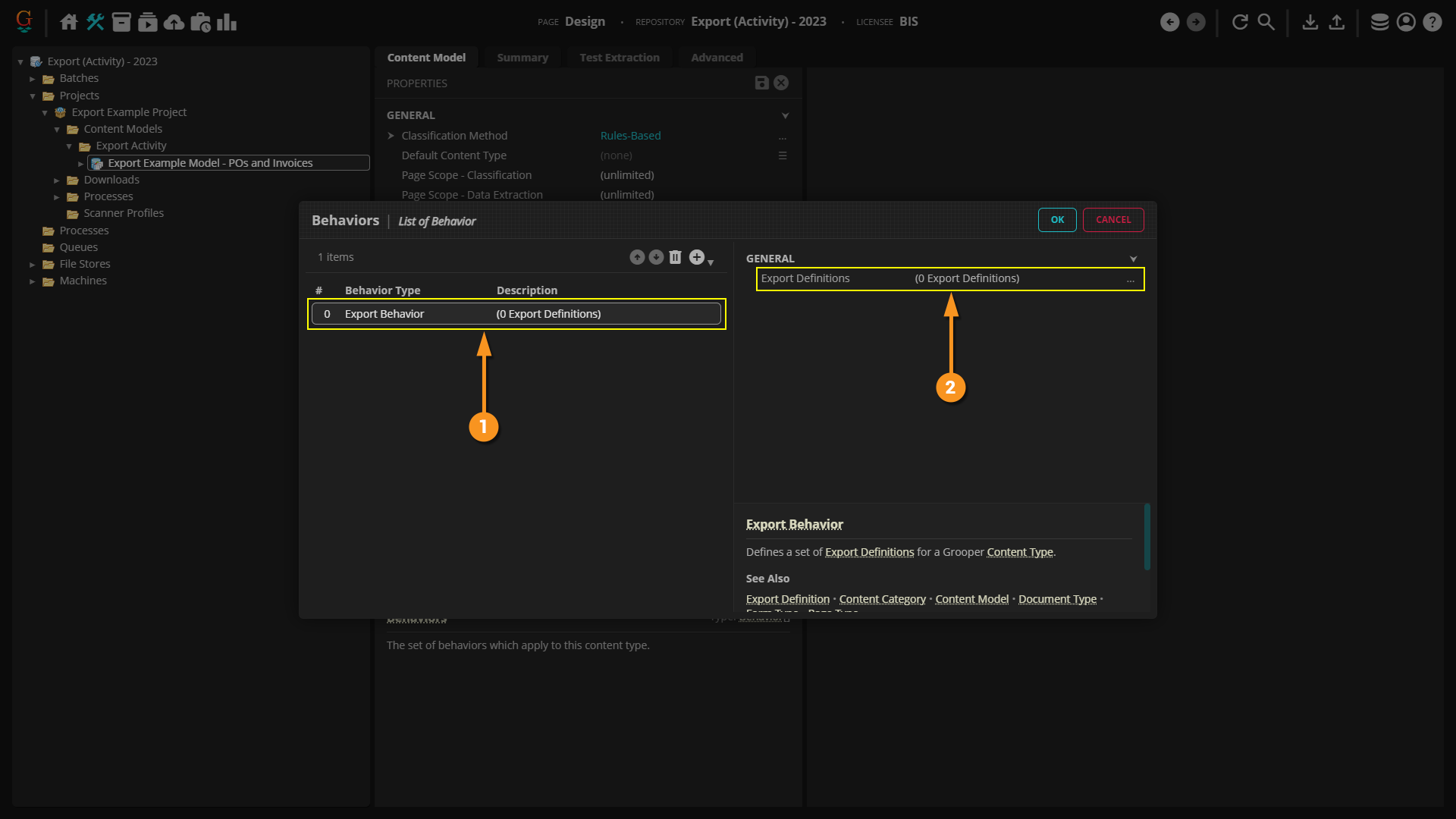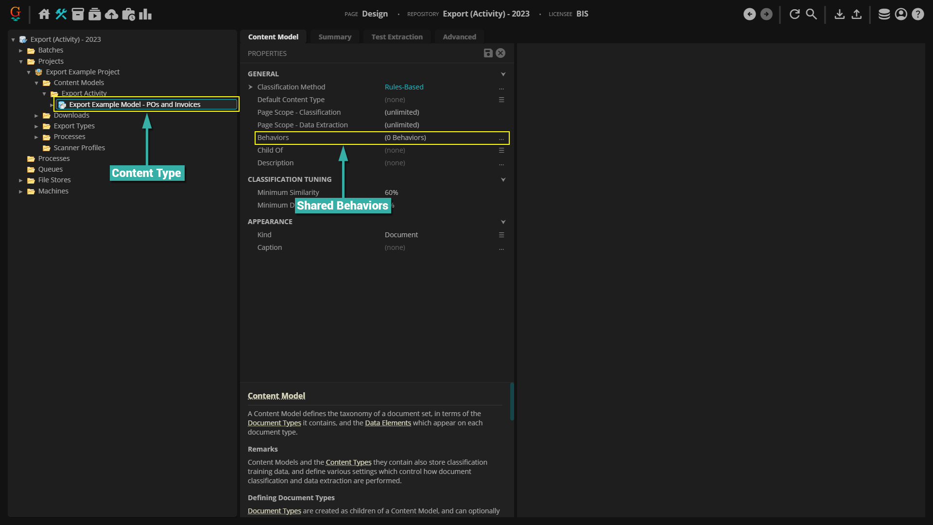 • Note in both cases, a Content Type is involved in configuring Export Behaviors. Whether local to the Export activity or as part of a Content Model's configuration, Grooper needs to know what to do upon export, given a certain Content Type (and its children Content Types if scoped to a Content Model or Content Category). Once Grooper knows what kind of document it's looking at, we can then inform it what to do in terms of exporting its document content.