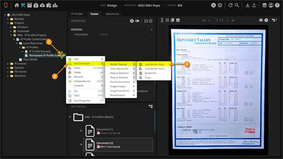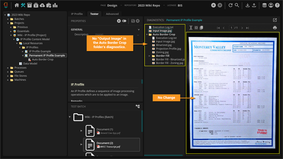 It's very rare when you make an IP Profile and everything works perfectly without doing some unit testing and adjusting some properties on a step or two. Take our "Auto Border Crop" step and our two documents with borders. As we configured the step, this is the results of our two transcripts.