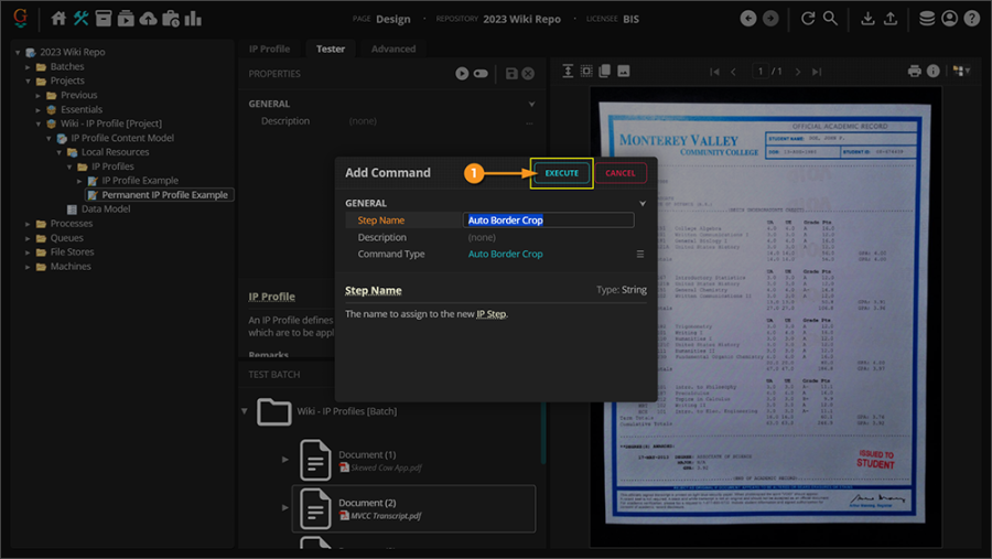 All alterations to the documents in the Test Batch are done in memory when configuring an IP Profile. Furthermore, any time you navigate to another document the IP Profile will "execute" on the temp batch (In other words, there's no need to press the Execute button unless you want to verify the results of the IP Profile on the currently selected document. |