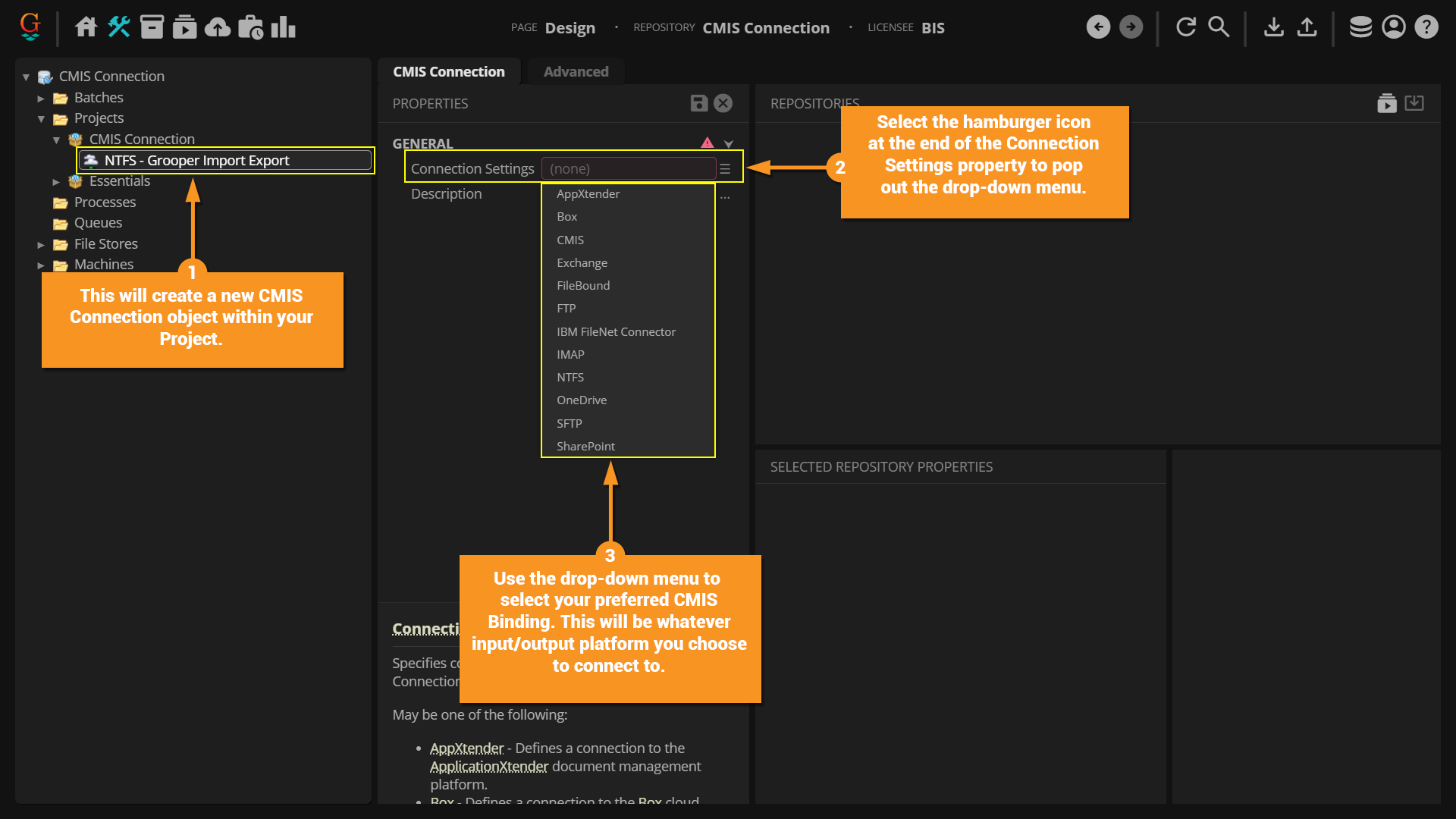 • You don't reference the parent CMIS Connection when configuring CMIS Import or CMIS Export. Instead you reference a CMIS Repository.