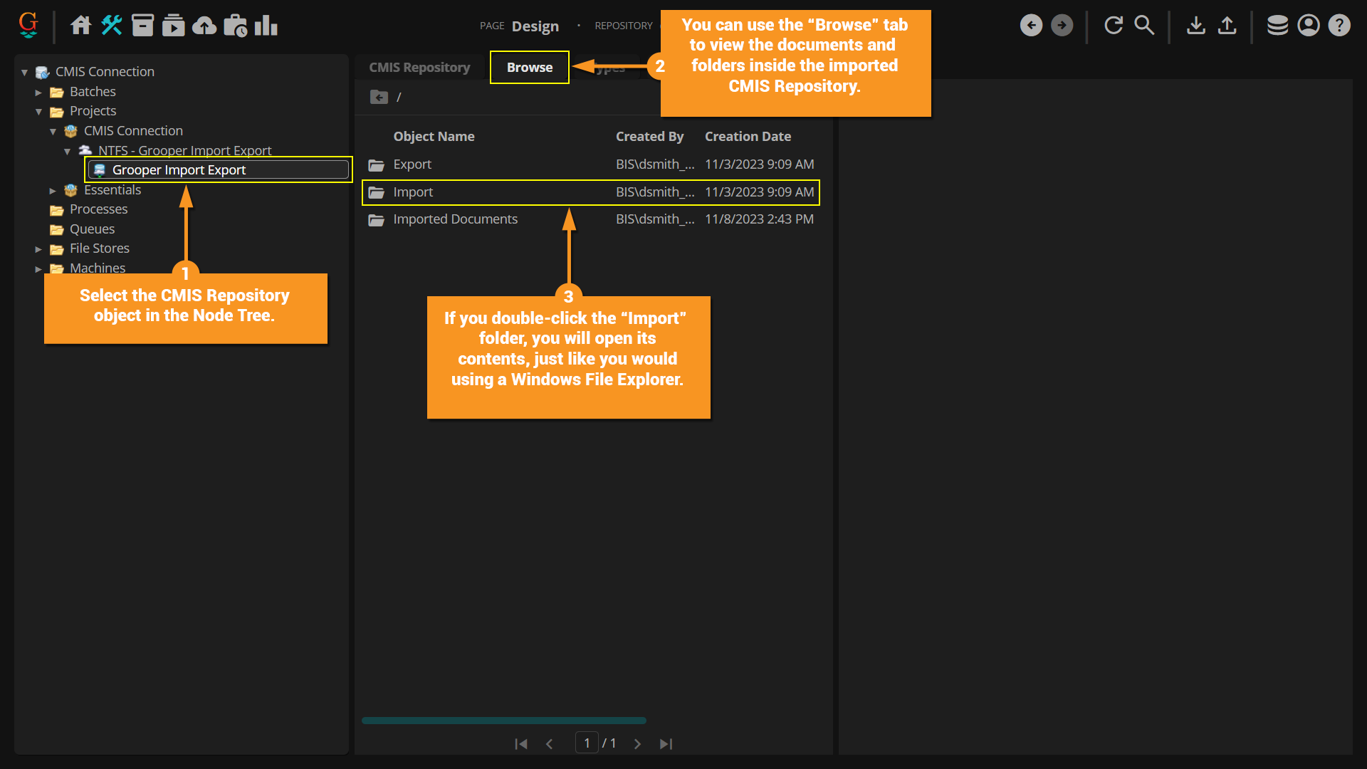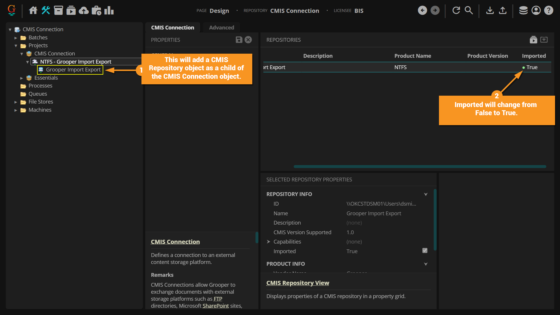 • The CMIS Repository nodes are what Grooper actually uses when configuring import/export operations.