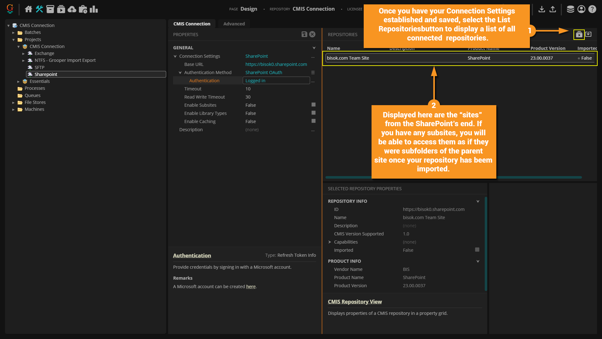 Expand out the "CMIS Connections" folder in the "Infrastructure" node.  Expand out your SharePoint connection and select your imported repository.