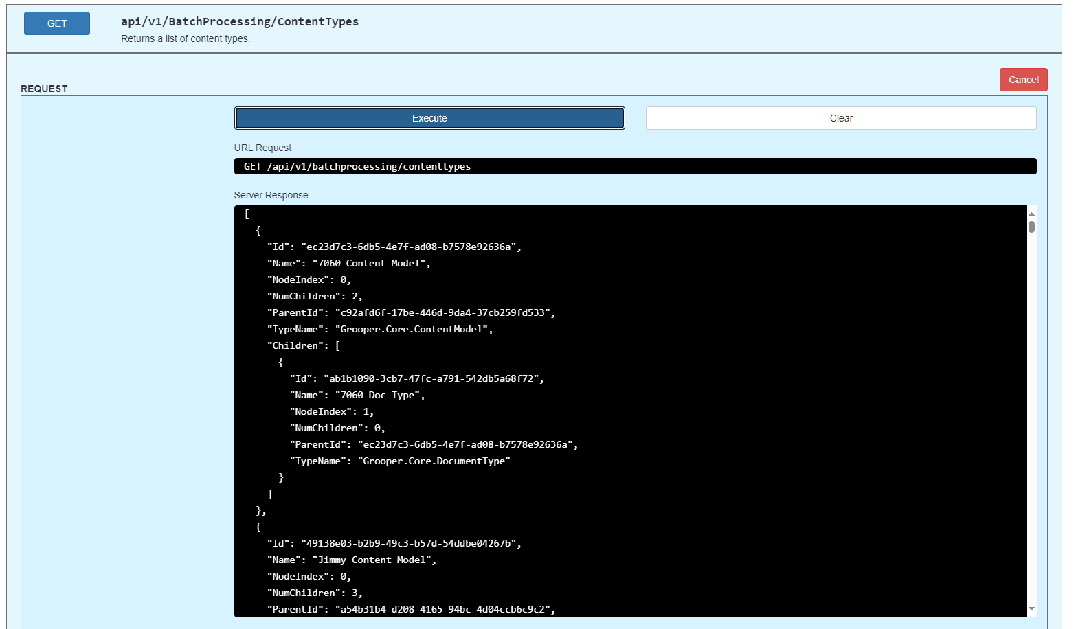 Enter the GUID of a Batch and press "Execute". You will receive a JSON response containing information about the Batch.