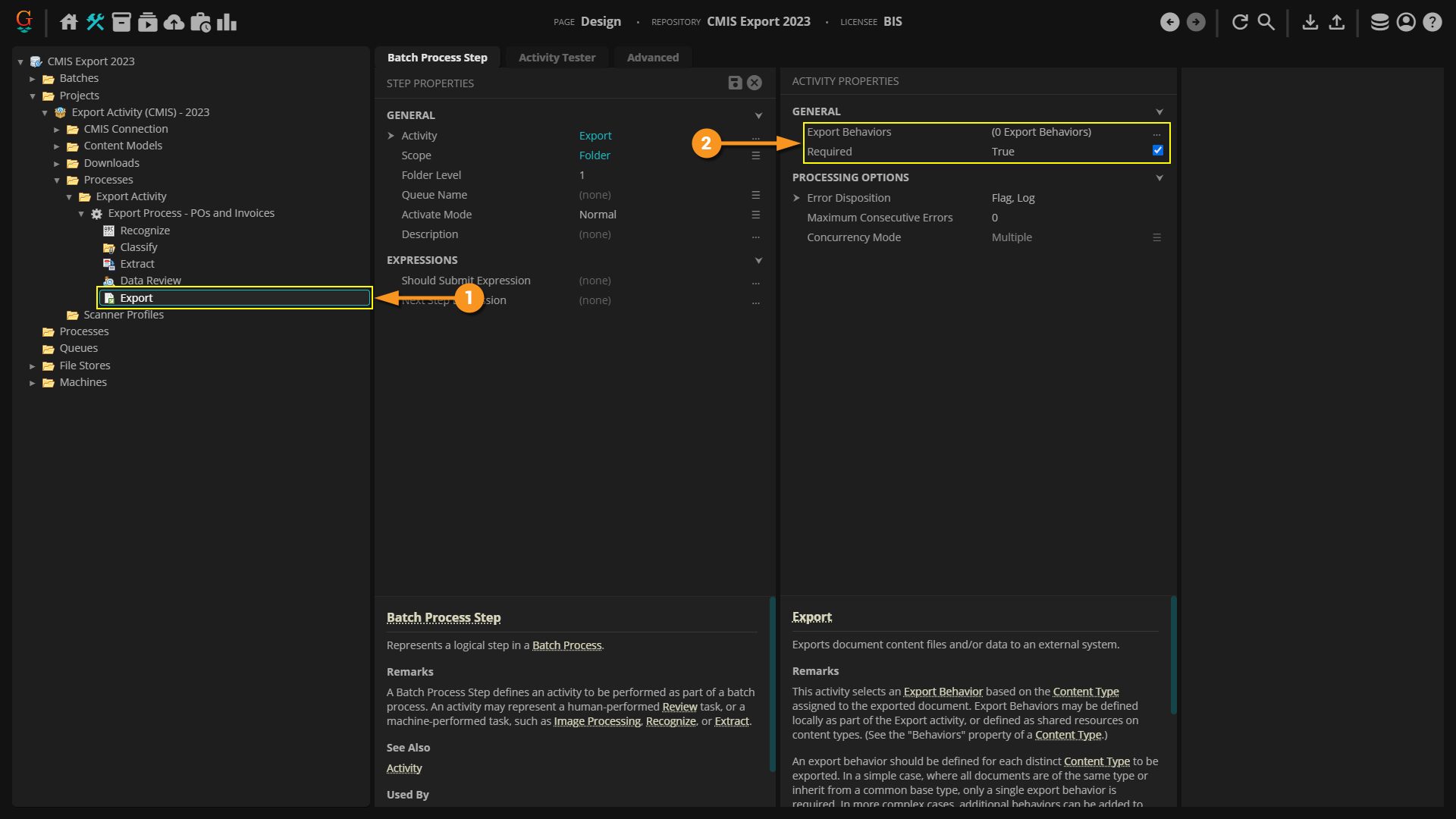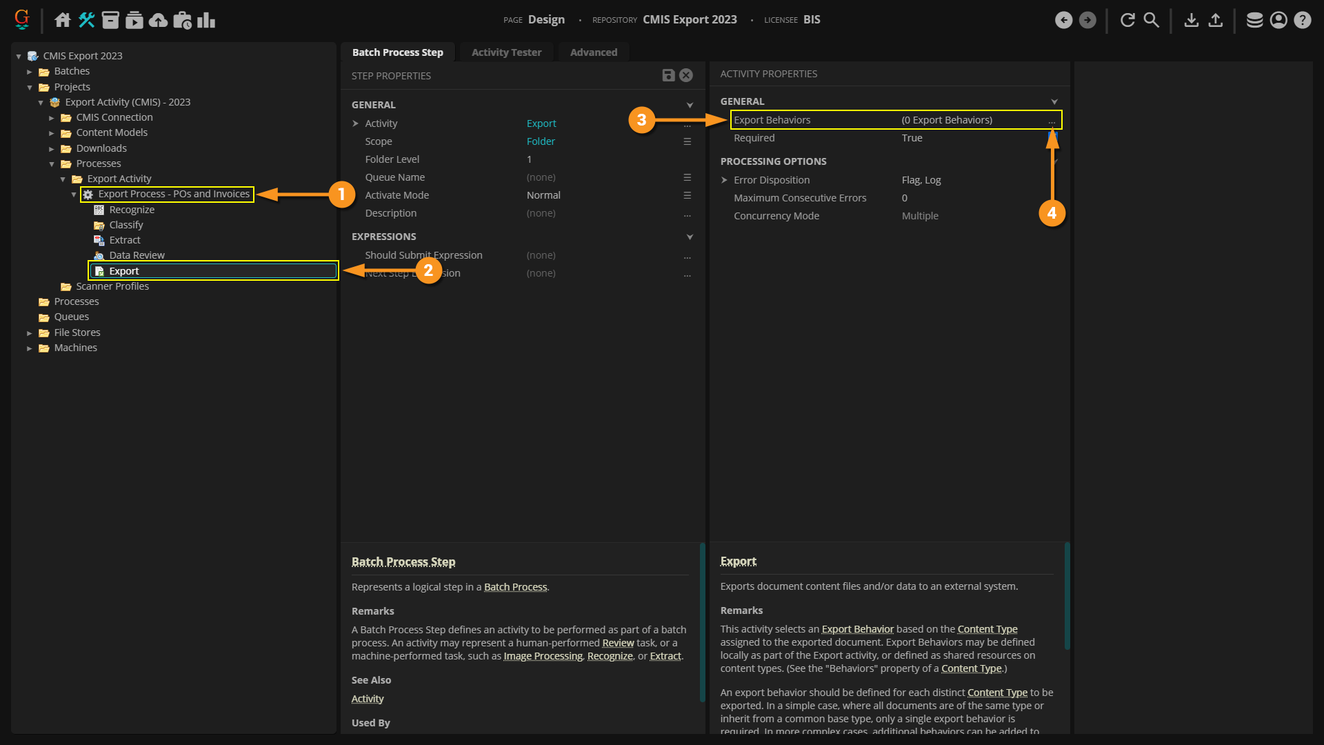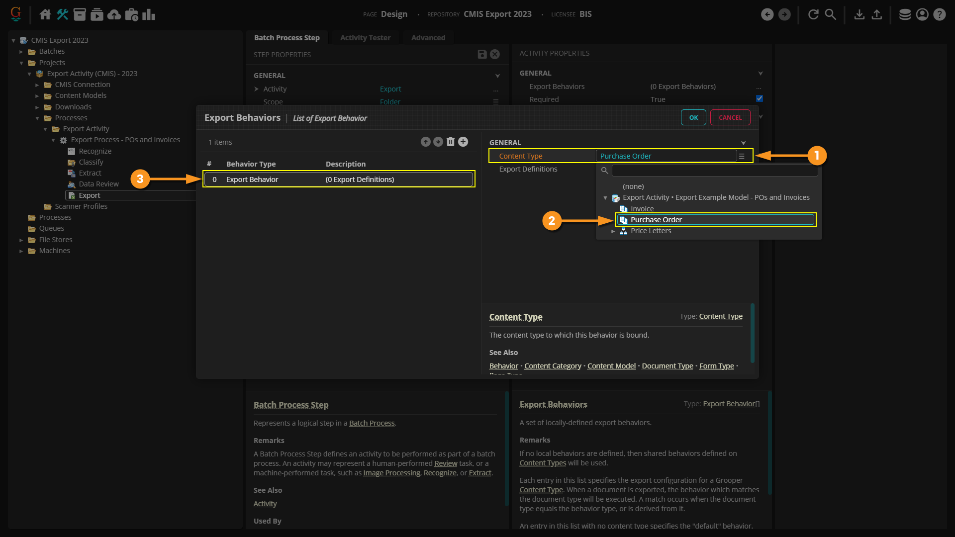 • If the order was reversed, the Content Model scoped Export Behavior would fire first, exporting all Batch Folders of all its Document Types, including "Purchase Order" Batch Folders. Then, the "Purchase Order" scoped Export Behavior (now second in list order in this scenario) would do nothing. The "Purchase Order" Batch Folders would have already been exported by the first Export Behavior.