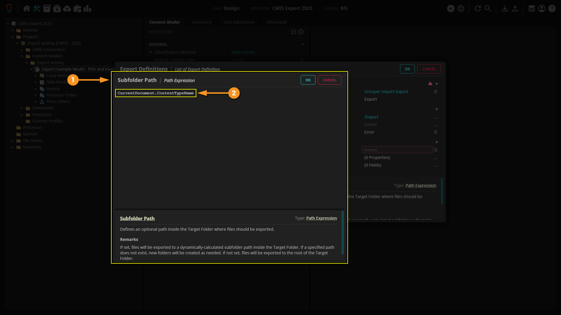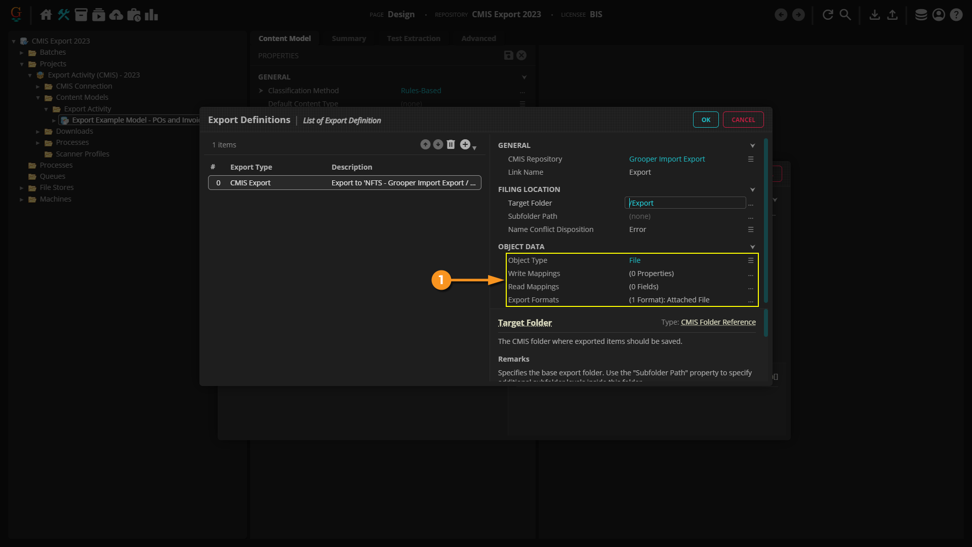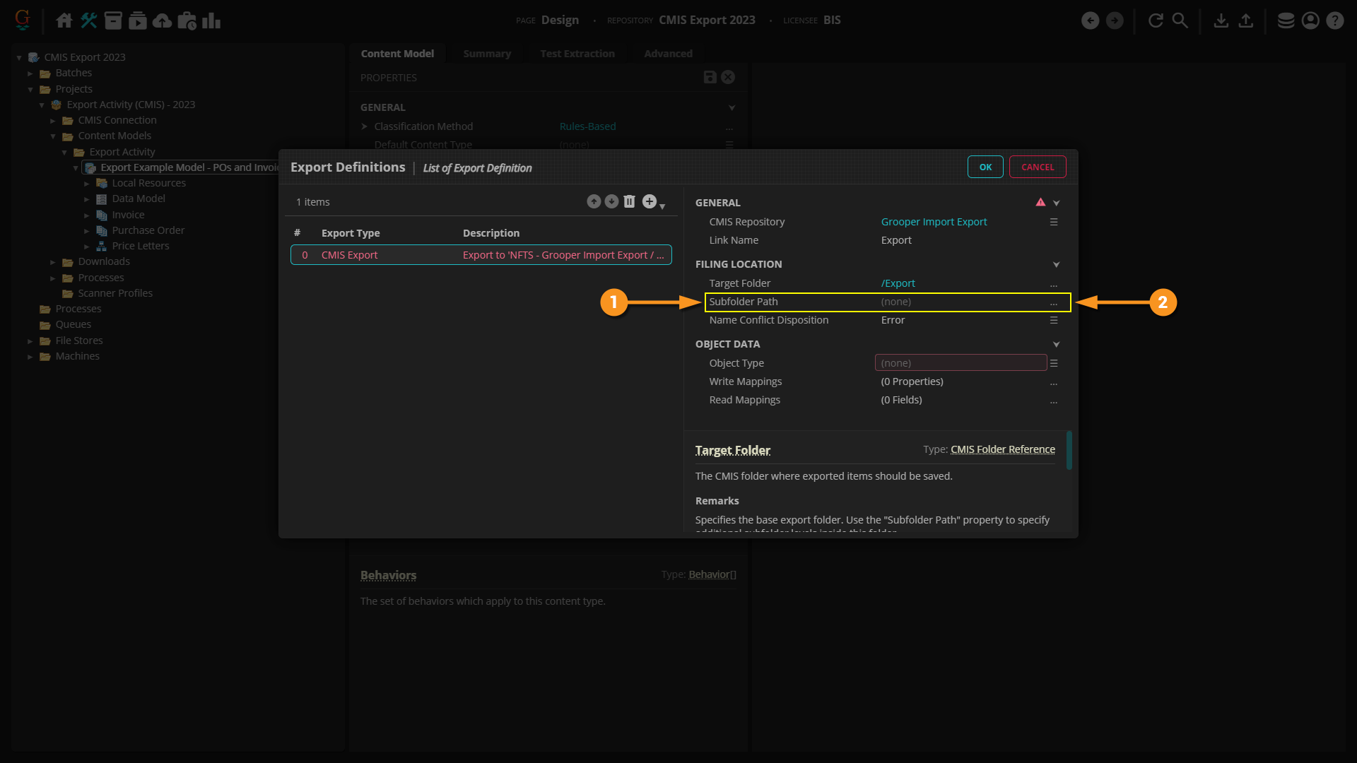 CMIS Export allows for the most advanced types of document export. It allows you to utilize document metadata and data Grooper extracts for export in a variety of ways. Many content management systems allow for document storage as well as storing metadata in fields in the storage platform. For applicable CMIS Bindings, CMIS Export document metadata and extracted data can be mapped to corresponding locations within the content management system, mapping a connection between objects or properties in a Content Model within Grooper (such as Data Fields in a Data Model) and their corresponding locations in the content management system (such as a column in a SharePoint site). Even for simpler platforms (like an NTFS file system) metadata can be used for file name and folder indexing.