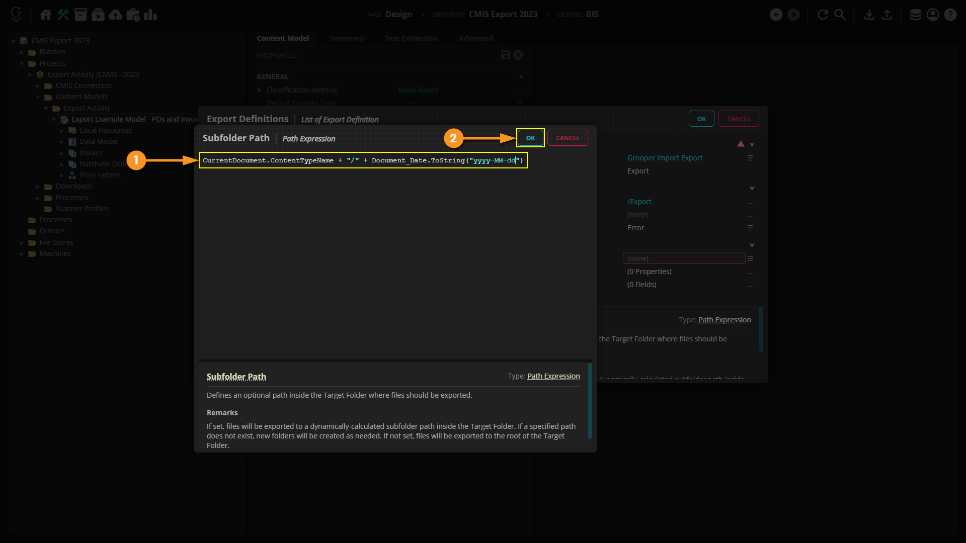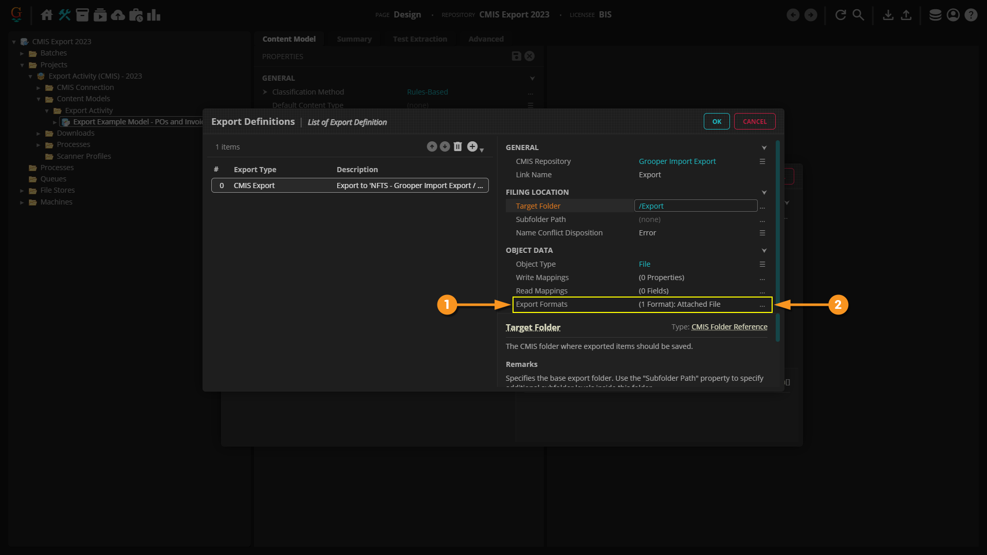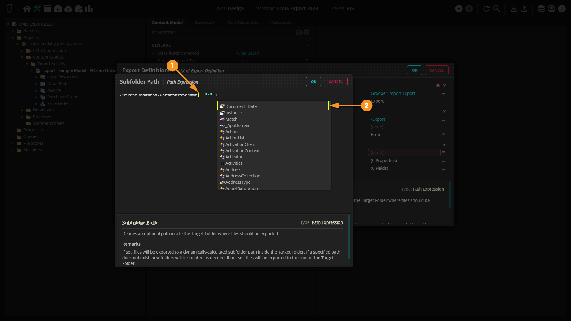 CMIS Export allows for the most advanced types of document export. It allows you to utilize document metadata and data Grooper extracts for export in a variety of ways. Many content management systems allow for document storage as well as storing metadata in fields in the storage platform. For applicable CMIS Bindings, CMIS Export document metadata and extracted data can be mapped to corresponding locations within the content management system, mapping a connection between objects or properties in a Content Model within Grooper (such as Data Fields in a Data Model) and their corresponding locations in the content management system (such as a column in a SharePoint site). Even for simpler platforms (like an NTFS file system) metadata can be used for file name and folder indexing.