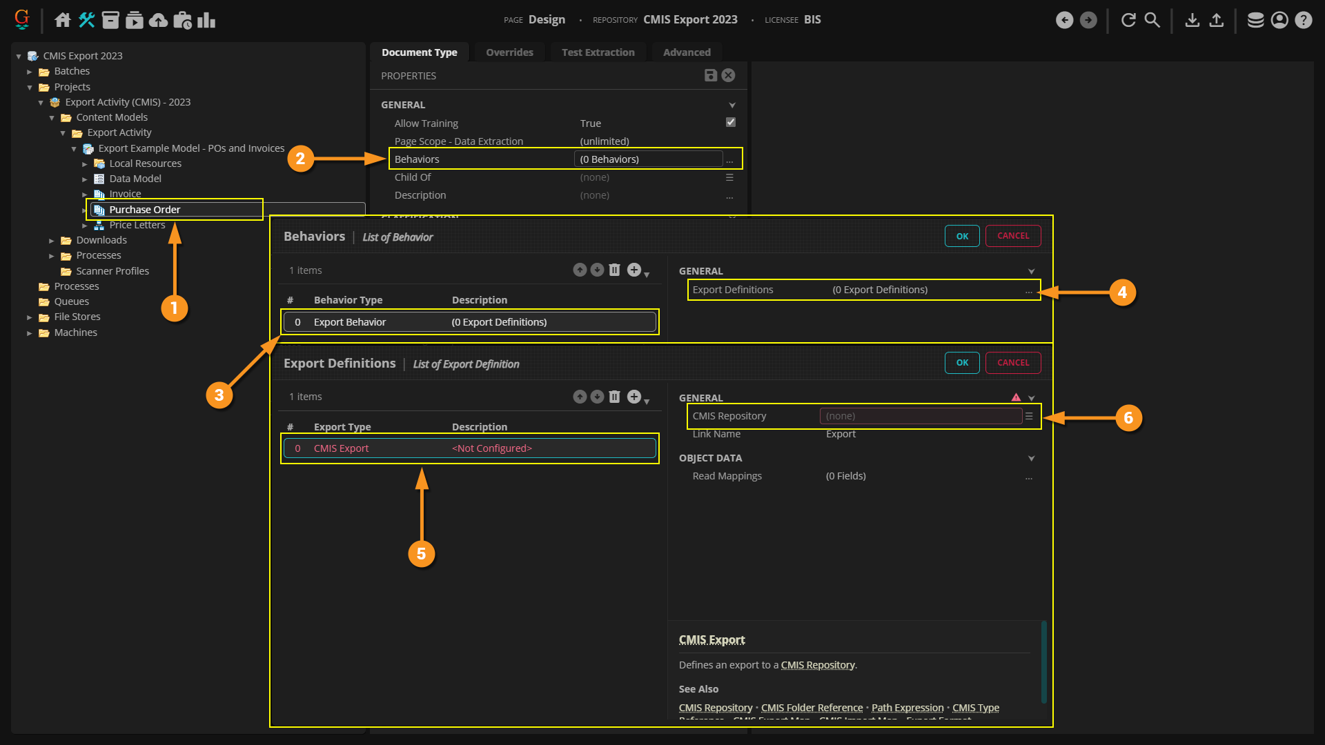 1. We will need to scope our Export Behavior to the "Purchase Order" Document Type to access all the Data Fields we need.