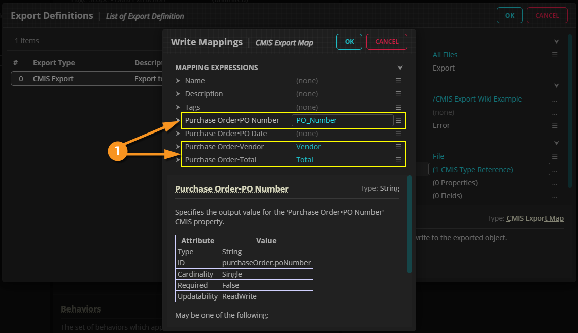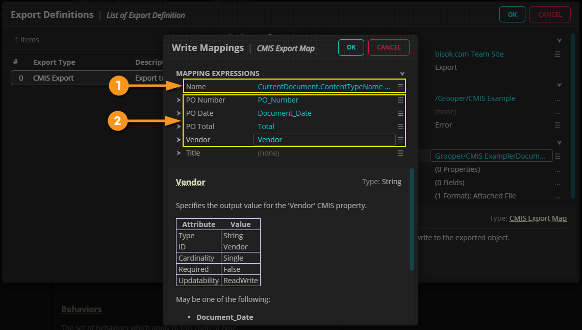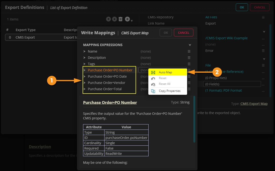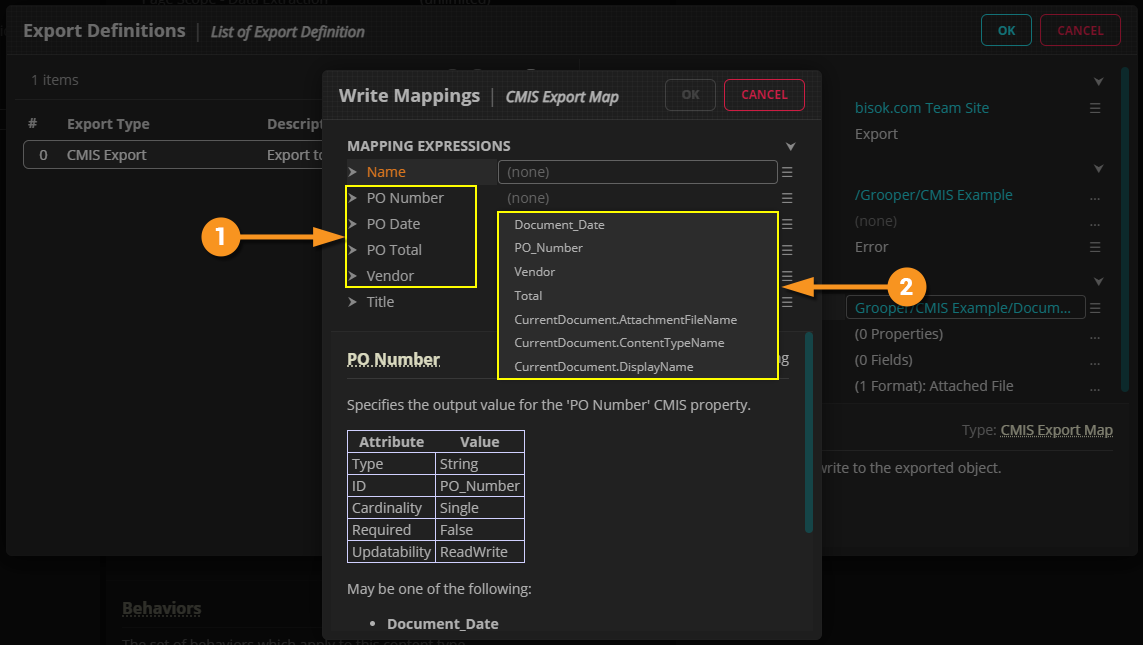 1. These mappable properties, "PO Number", "PO Date", "Vendor" and "Total", are the editable metadata fields in the metadata template we selected using the Secondary Types property.