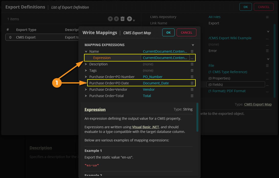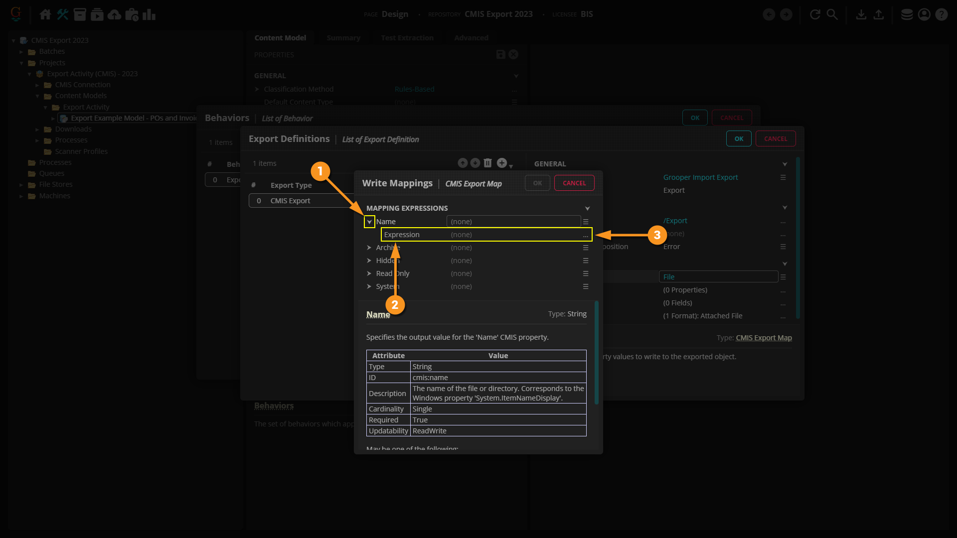 2. Furthermore, since we're at a lower level in our Content Model's hierarchy, we have more access to more Data Elements when writing expression based mappings as well. For the Cmis Name mapping, we used the following expression: