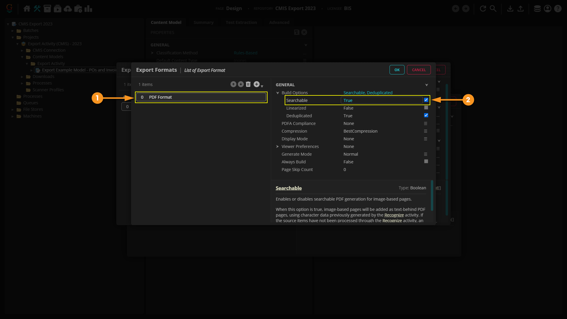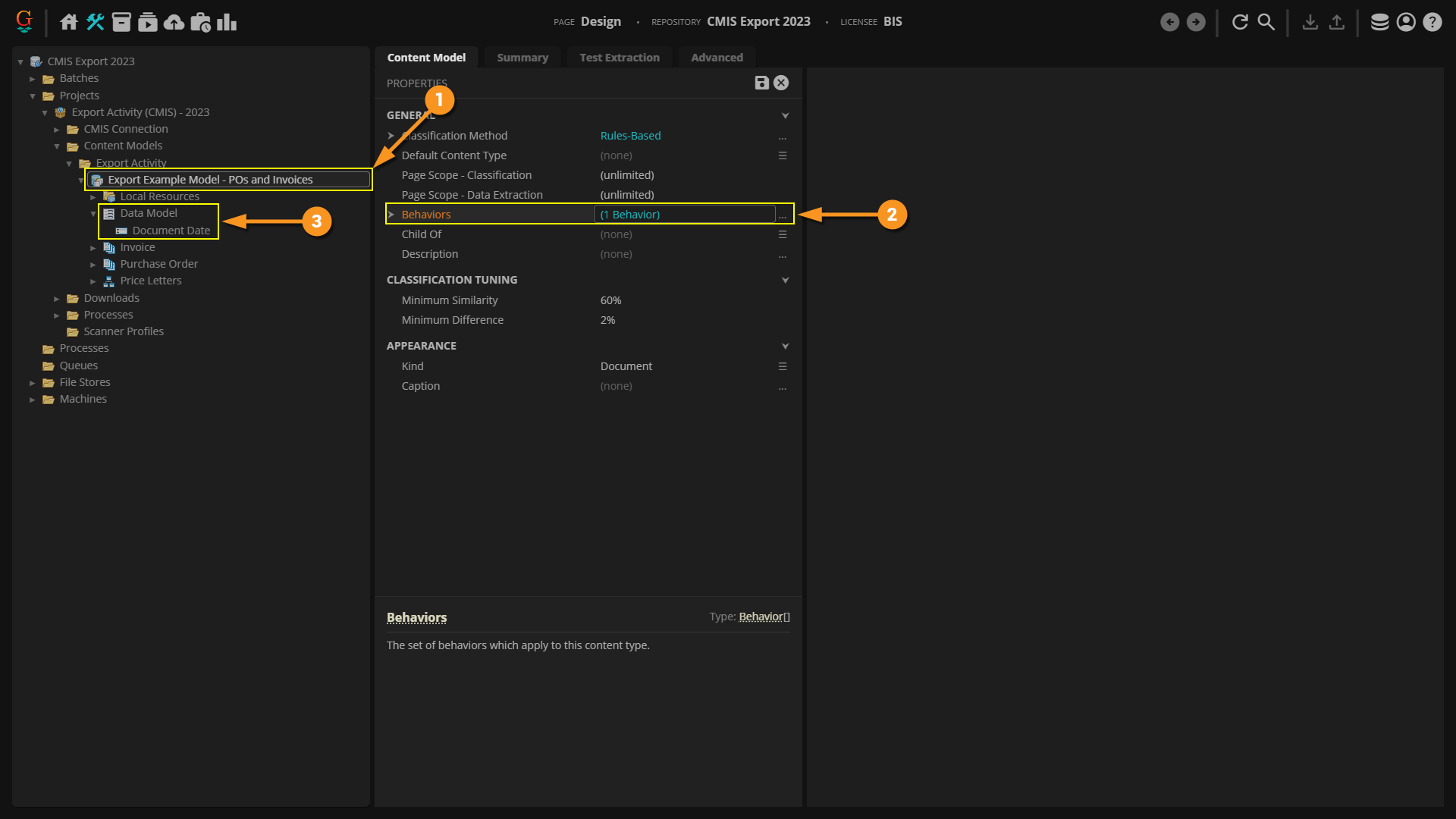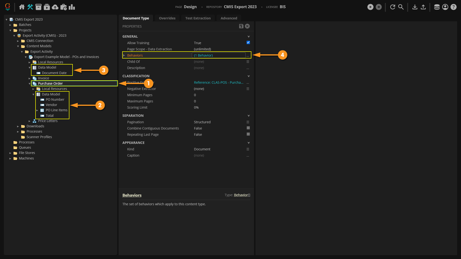• Imagine this second Export Behavior was scoped to the parent Content Model. The first Export Behavior would export just the "Purchase Order" Batch Folders. Then, the second Export Behavior would export any Batch Folders of any other Document Type in the Content Model.