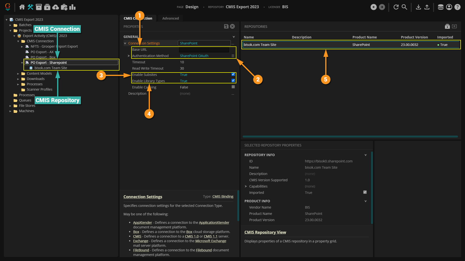 • You don't reference the parent CMIS Connection when configuring CMIS Import or CMIS Export. Instead you reference a CMIS Repository.