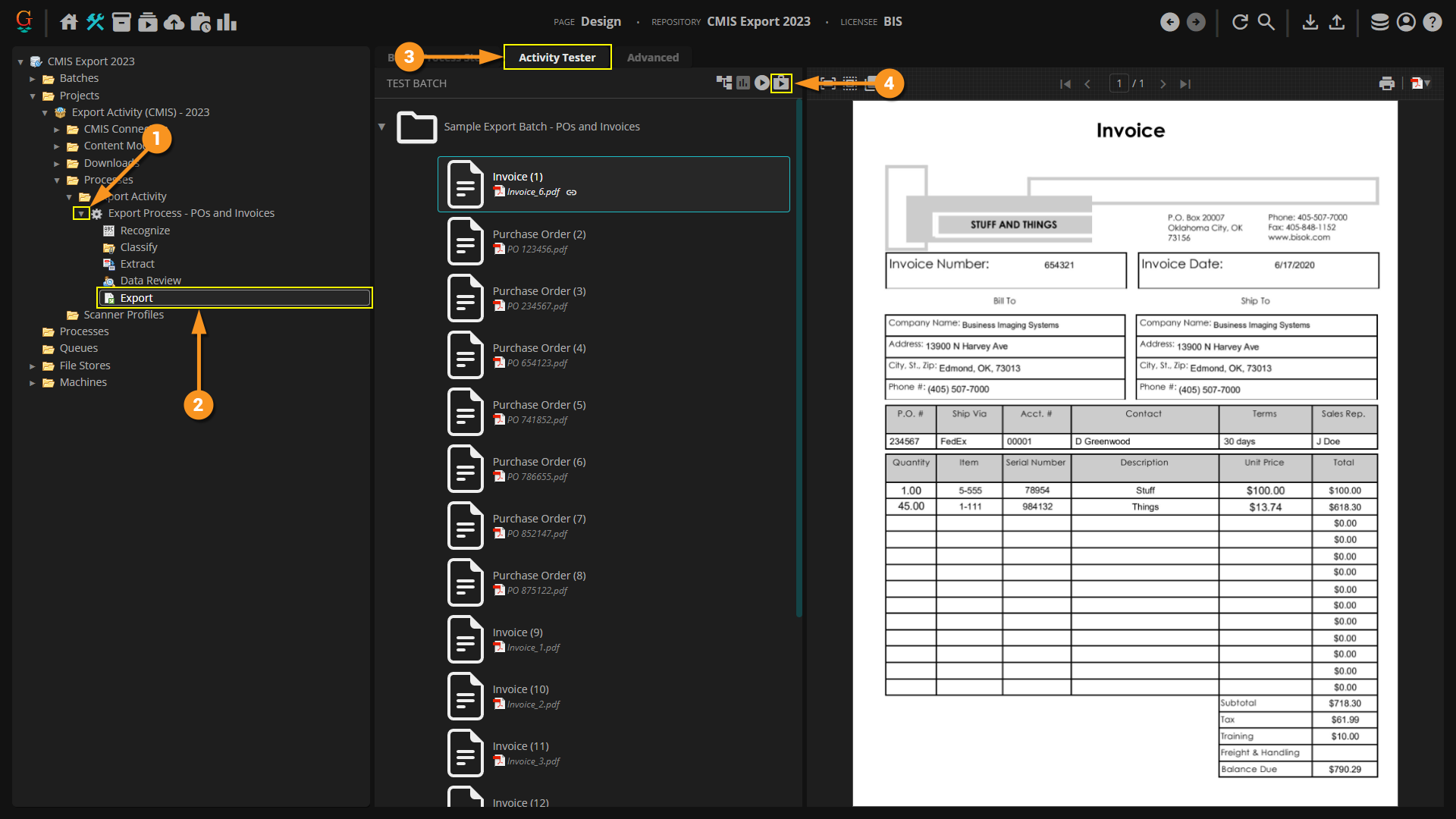 • Root Node > Batch Processing > Batches > Test > Export Activity > Sample Export Batch - POs and Invoices