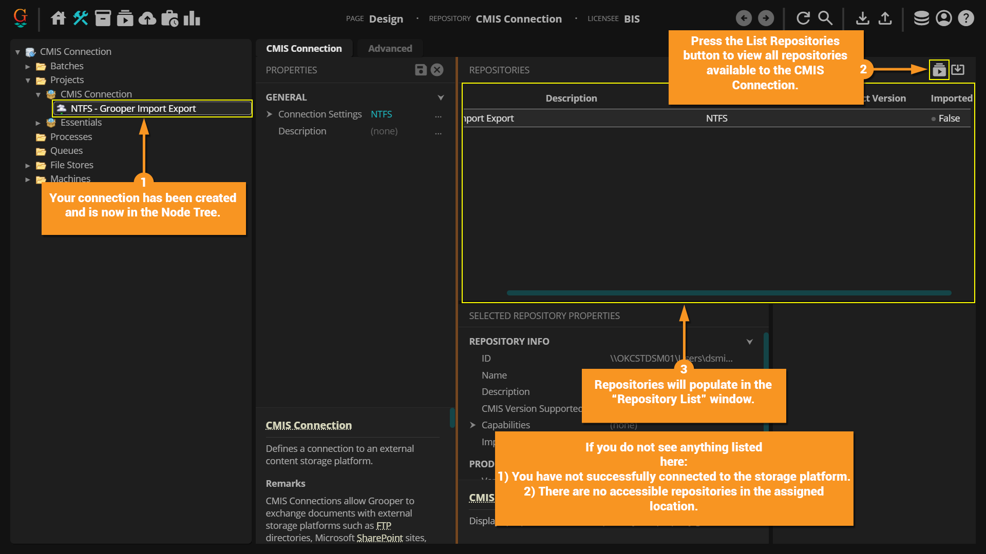 • The CMIS Repository nodes are what Grooper actually uses when configuring import/export operations.