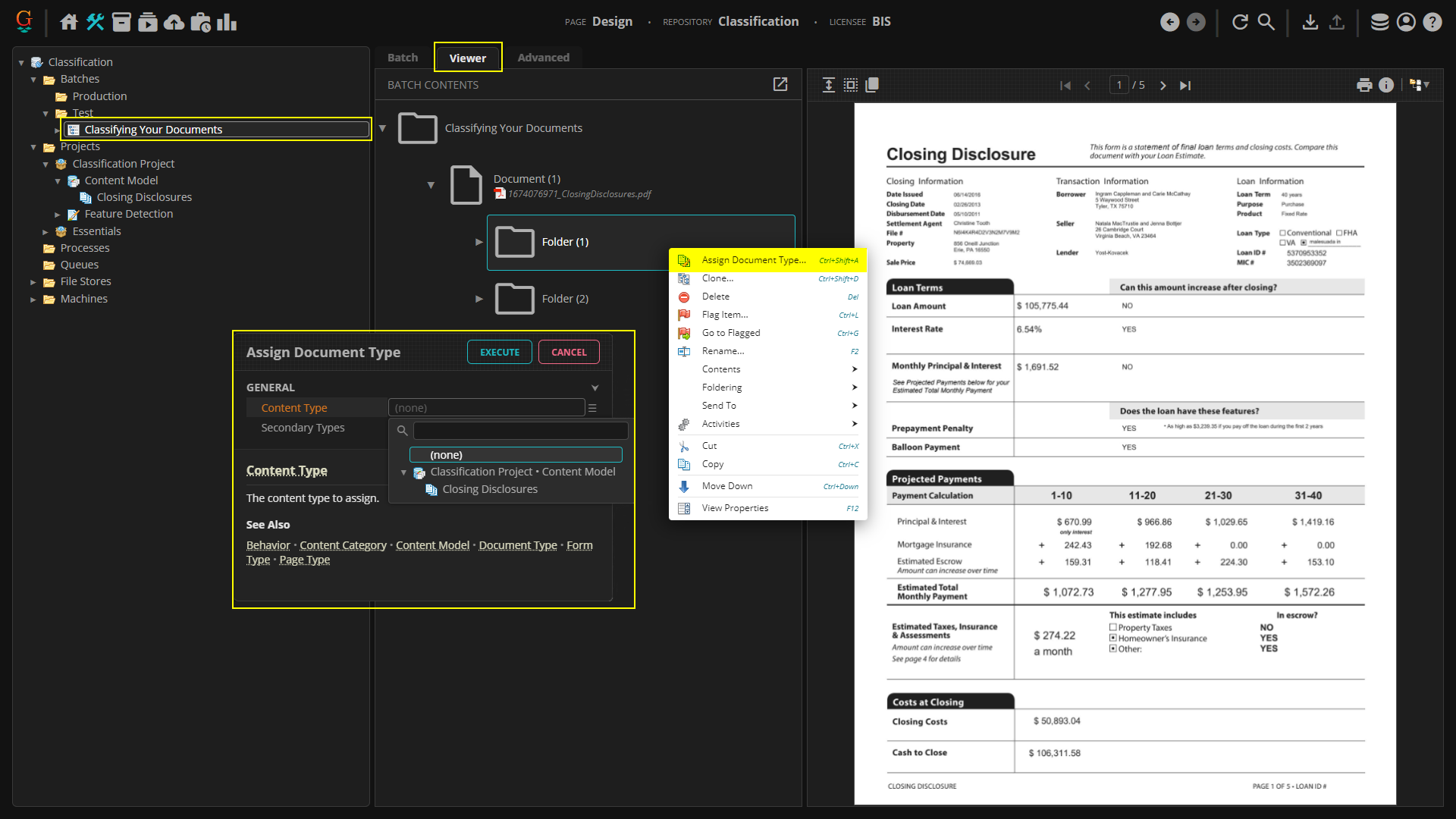 All the logic and setup to take an unorganized document set and categorize documents within them as Document Types is created in the Content Model. The Classify activity uses that information to automatically classify documents in a Batch as Document Types in the model.