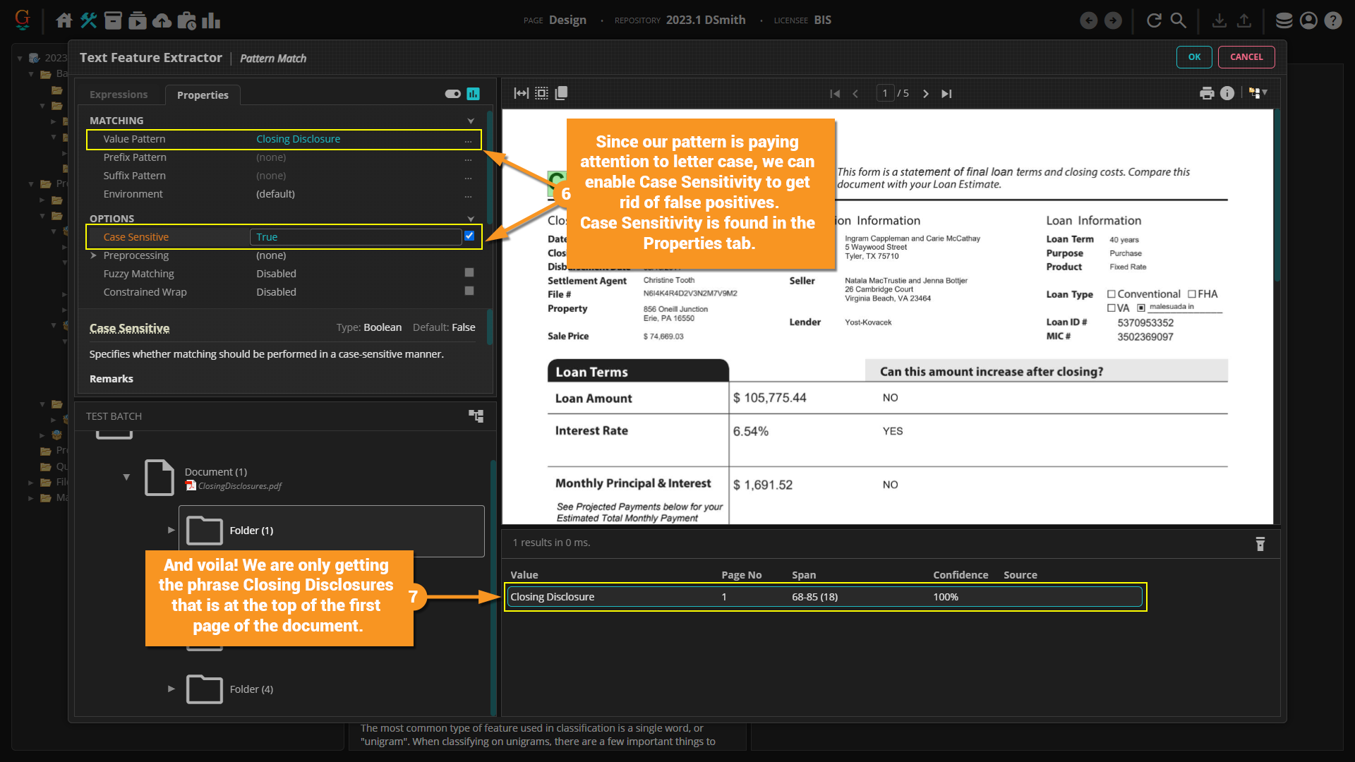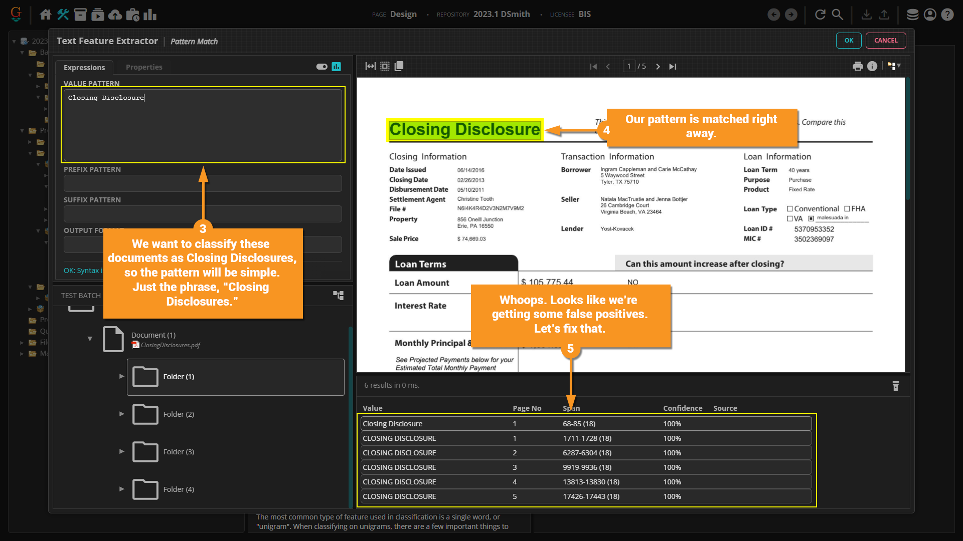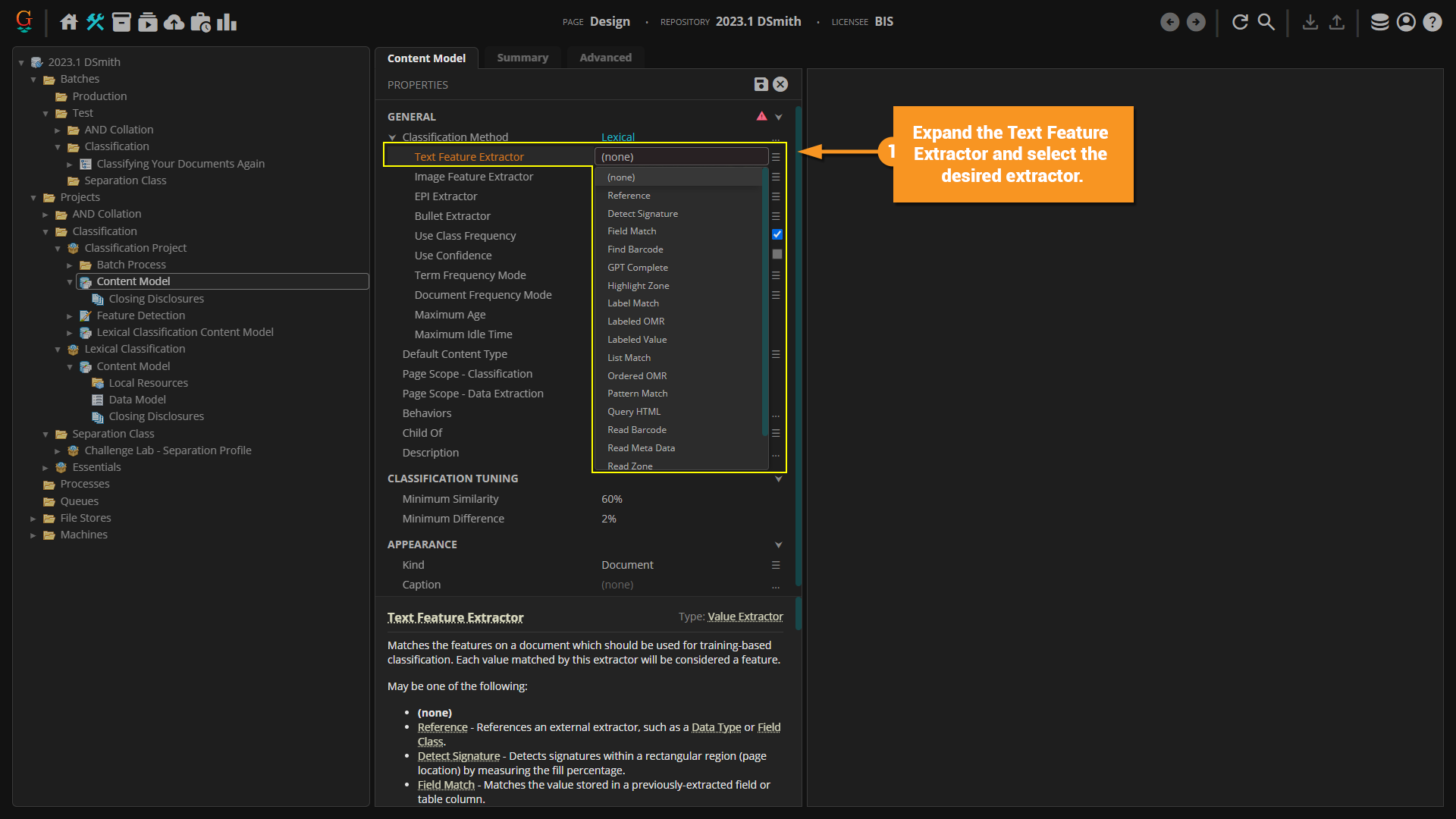 In order to find this lexical content, you first need to set a Text Feature Extractor. A Text Feature Extractor is set to extract text-based values from document samples to be used as identifiable features of the document.
