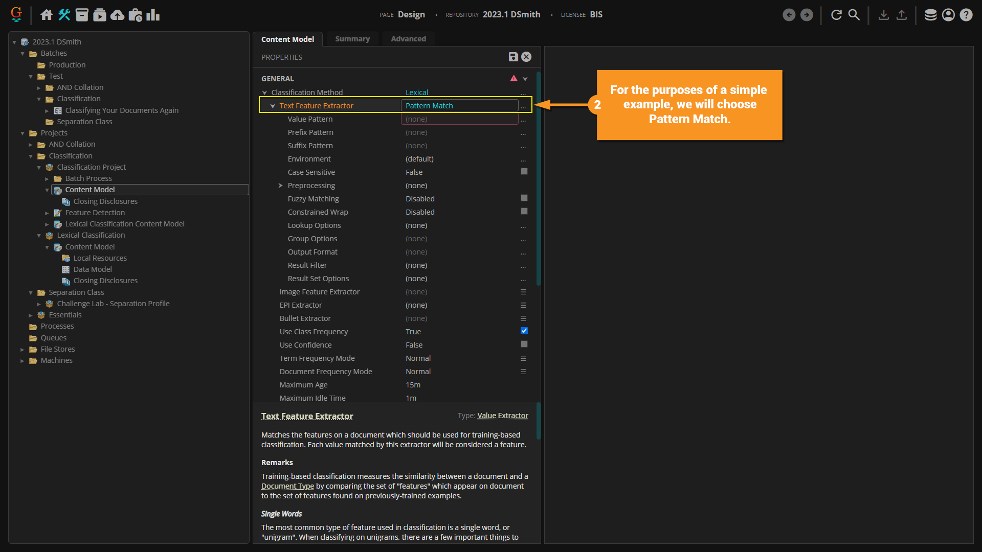This is the first thing you will do when configuring Lexical classification. If you're training the words in a document, you need to tell Grooper how to find those words first! After Lexical is chosen as the Classification Method of a Content Model, the Text Feature Extractor can be set in the Lexical sub-properties. This can be a Reference to a Data Type or an Internal regular expression pattern.